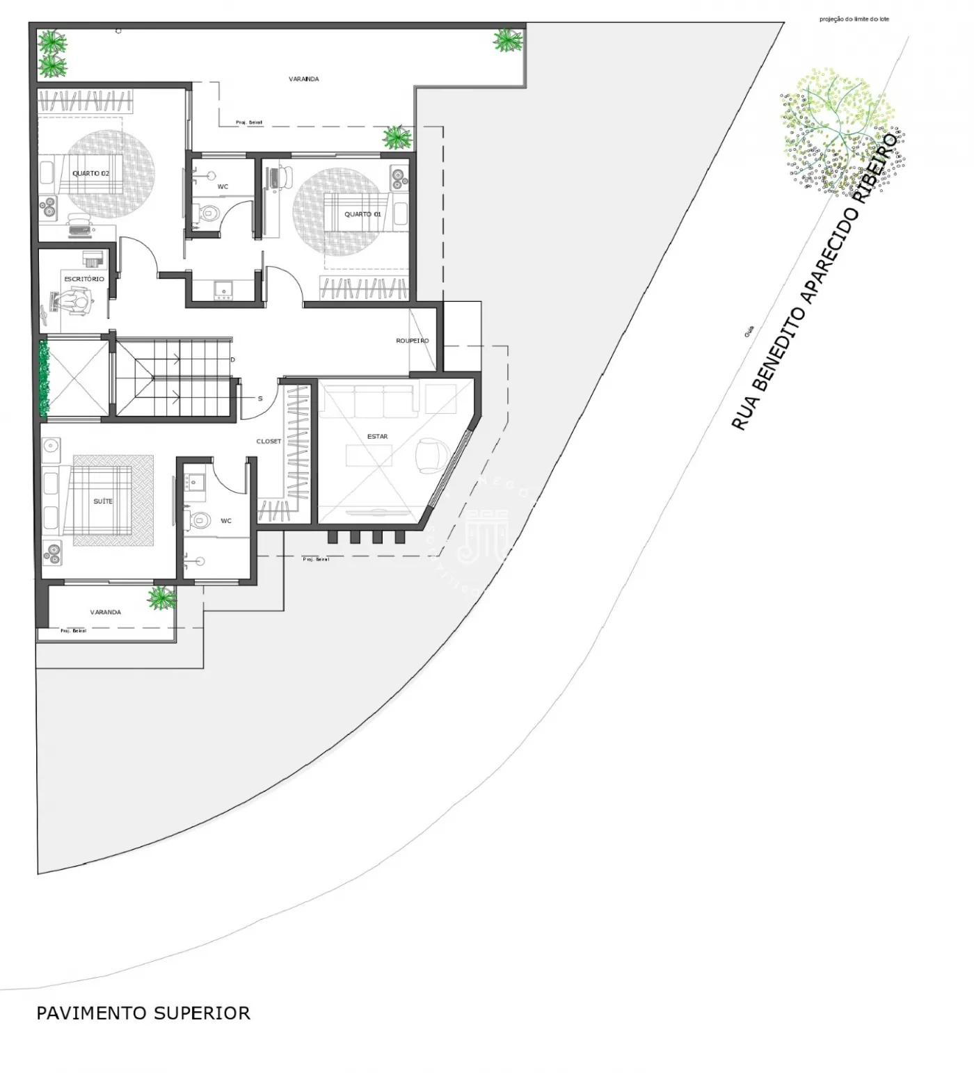 No piso superior é comporta por 3 dormitórios, sendo 1 suite com closet e varanda, um escritorio, banheiro social.