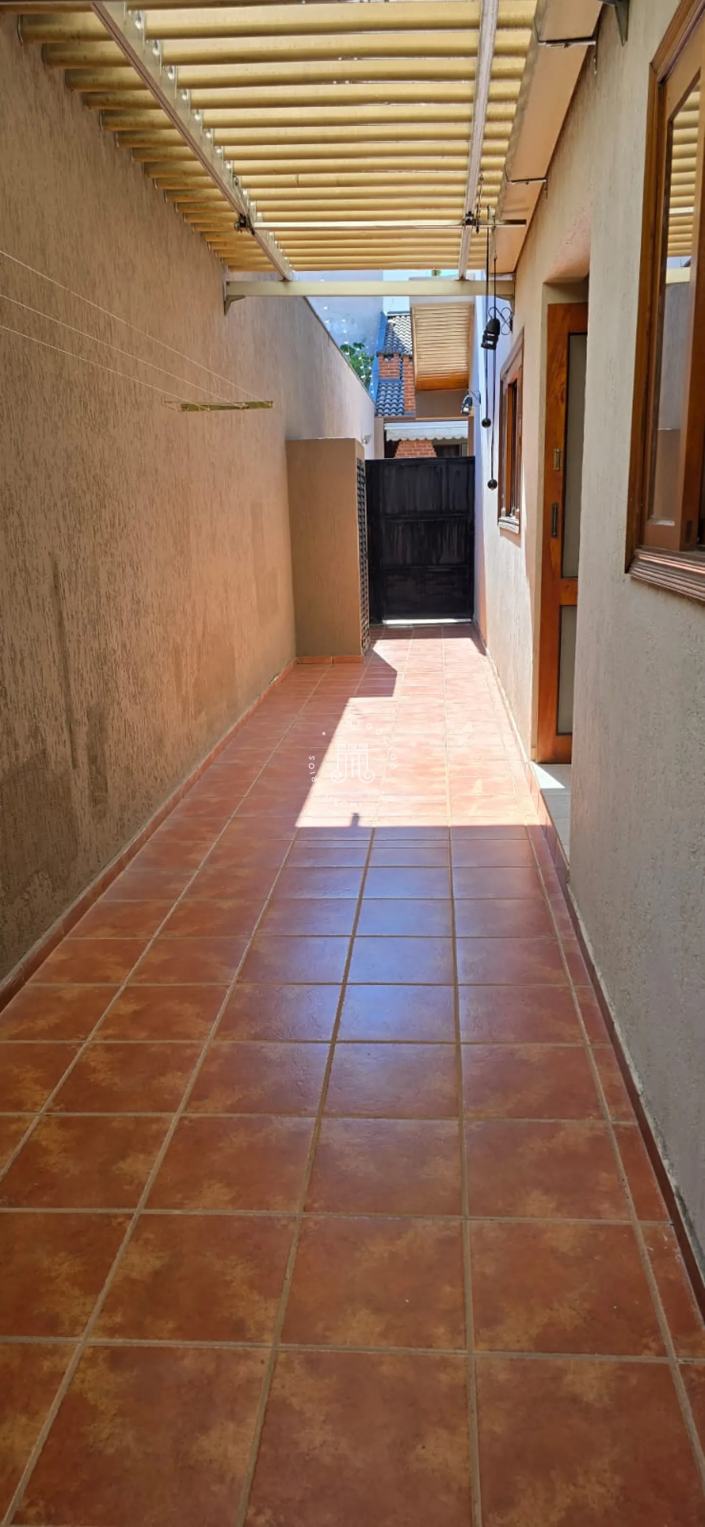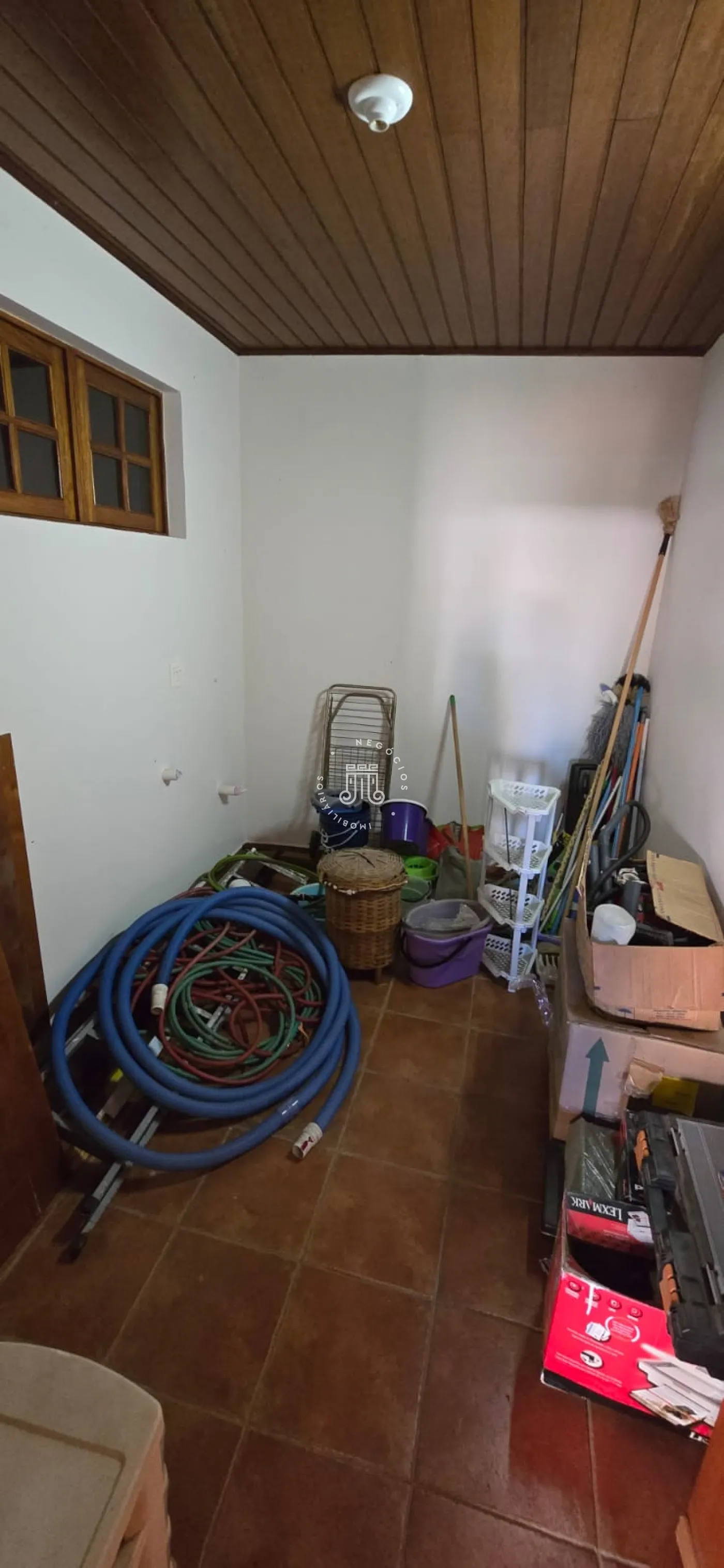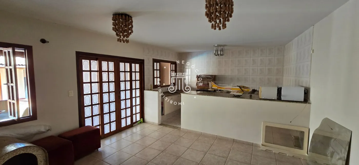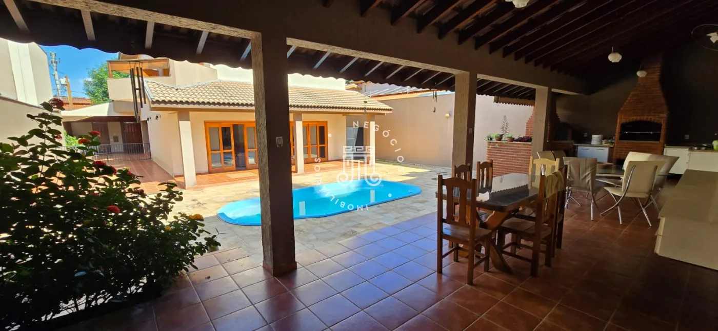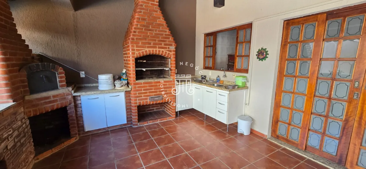 A casa possui sala grande para três ambiente, cozinha com armários embutidos e área de serviço. Vagas cobertas para 4 carros e portão eletrônico. Possui piscina e edícula com área gourmet: churrasqueira, forno a lenha e forno de pizza, e mais um quarto de cômodo e despensa e um quarto com banheiro, mais sala e cozinha social.