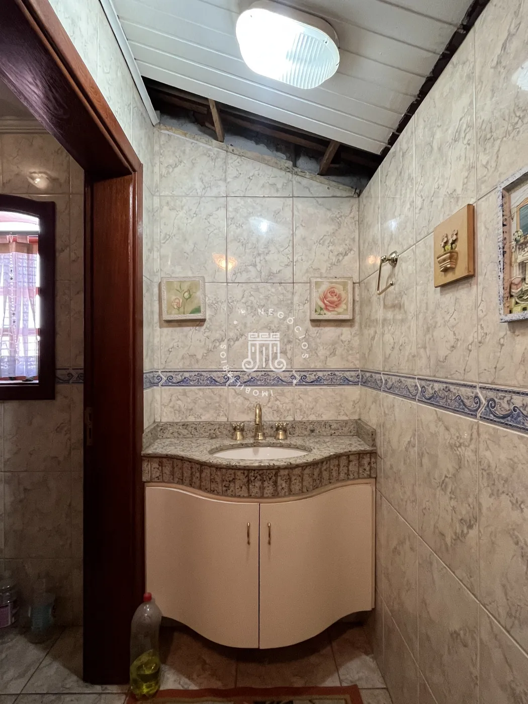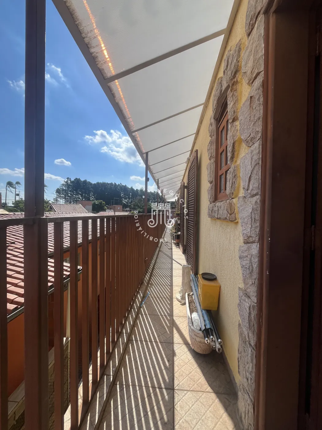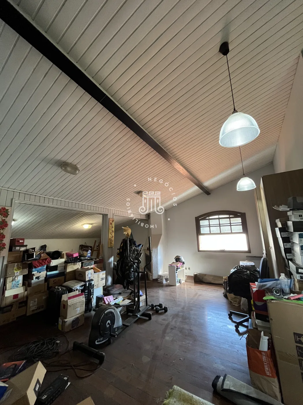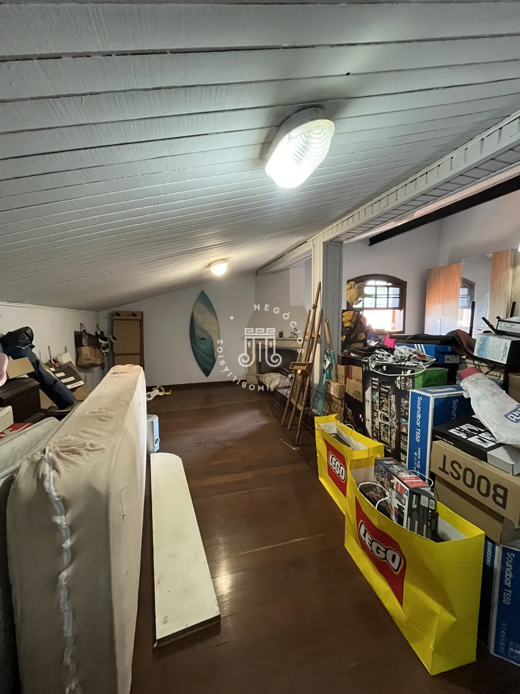 No piso superior está a residência, composta por 3 dormitórios, sendo 2 suítes, além de banheiro social e lavabo. A área interna inclui cozinha com armários planejados, lavanderia, sala de estar e sala de jantar com piso em carpete de madeira. O imóvel conta com porta de aço e portão eletrônico. Há varanda em toda a lateral da casa, atendendo a sala de estar, a sala de jantar e a suíte principal.