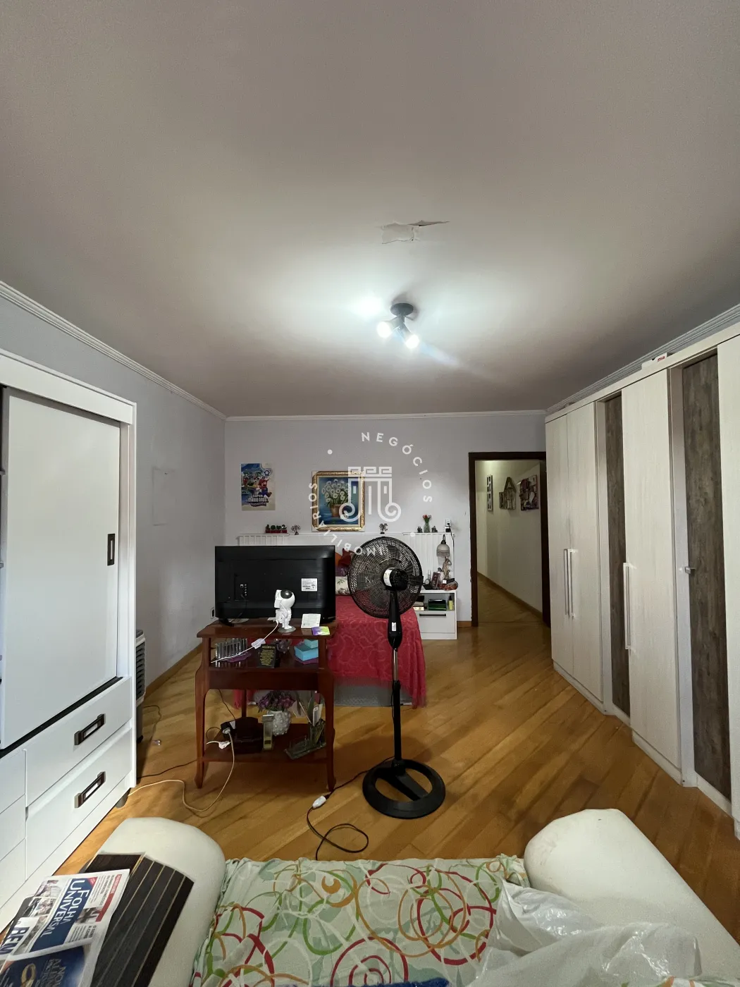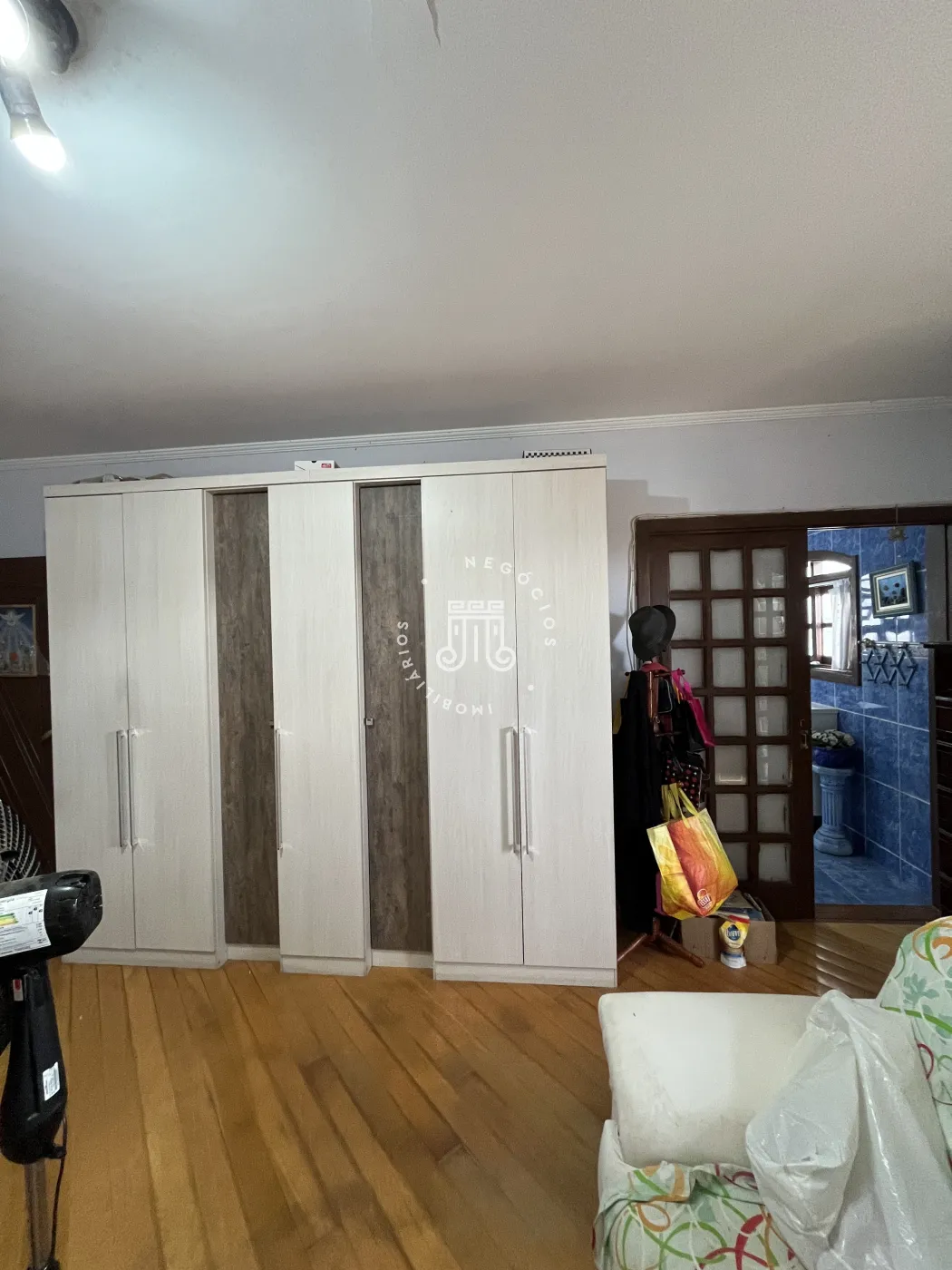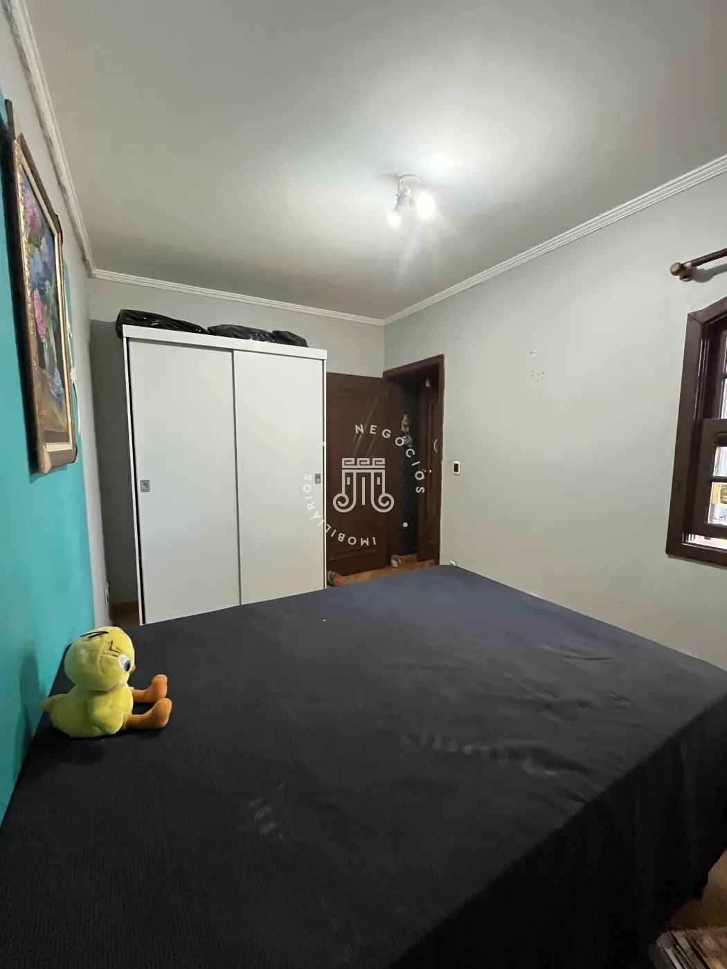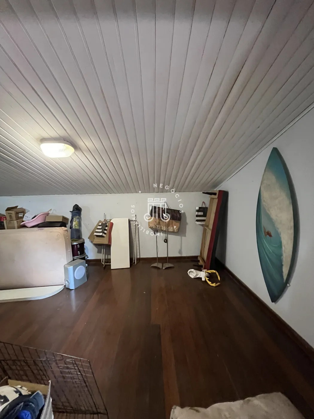 No piso superior está a residência, composta por 3 dormitórios, sendo 2 suítes, além de banheiro social e lavabo. A área interna inclui cozinha com armários planejados, lavanderia, sala de estar e sala de jantar com piso em carpete de madeira. O imóvel conta com porta de aço e portão eletrônico. Há varanda em toda a lateral da casa, atendendo a sala de estar, a sala de jantar e a suíte principal.