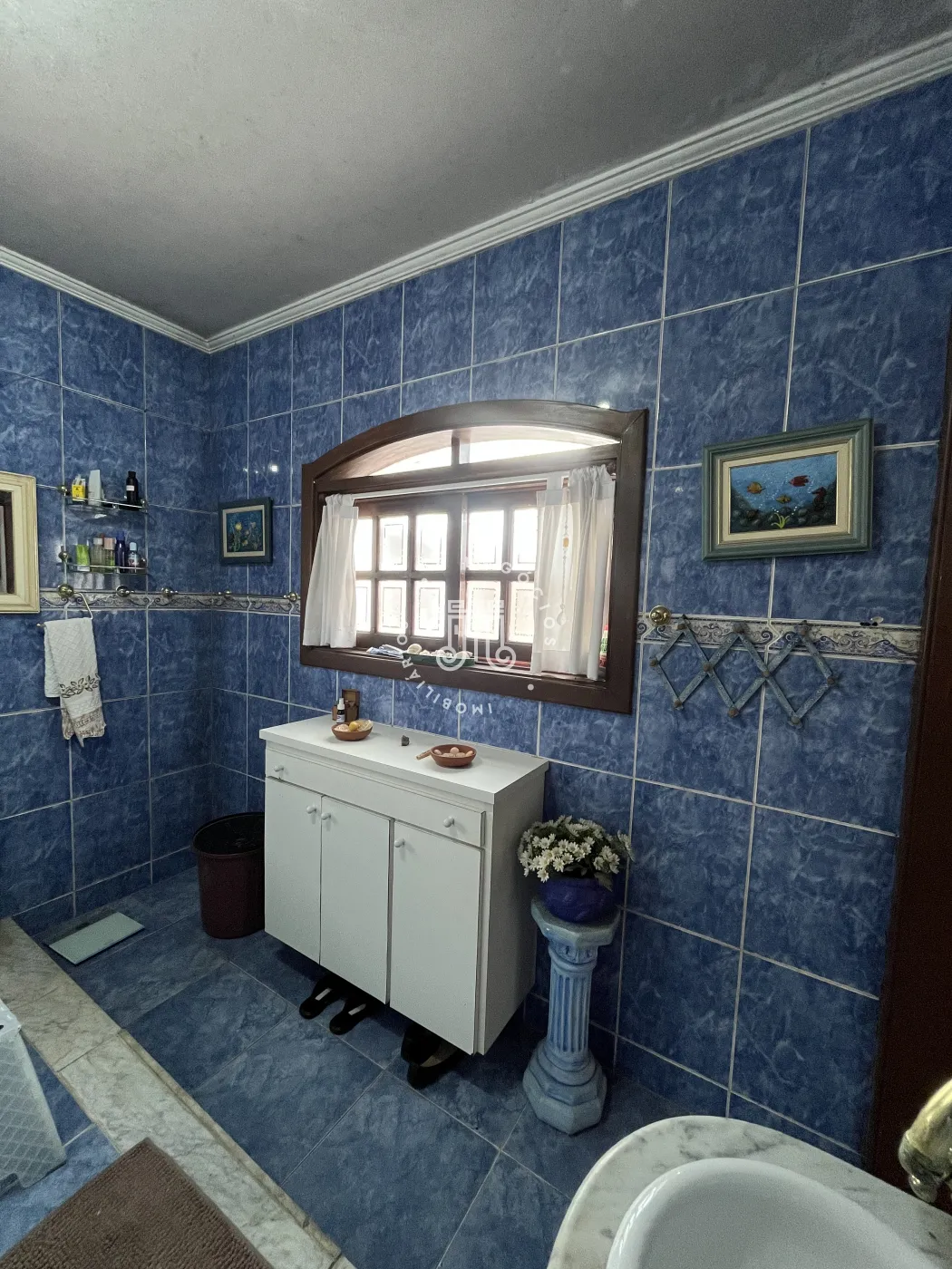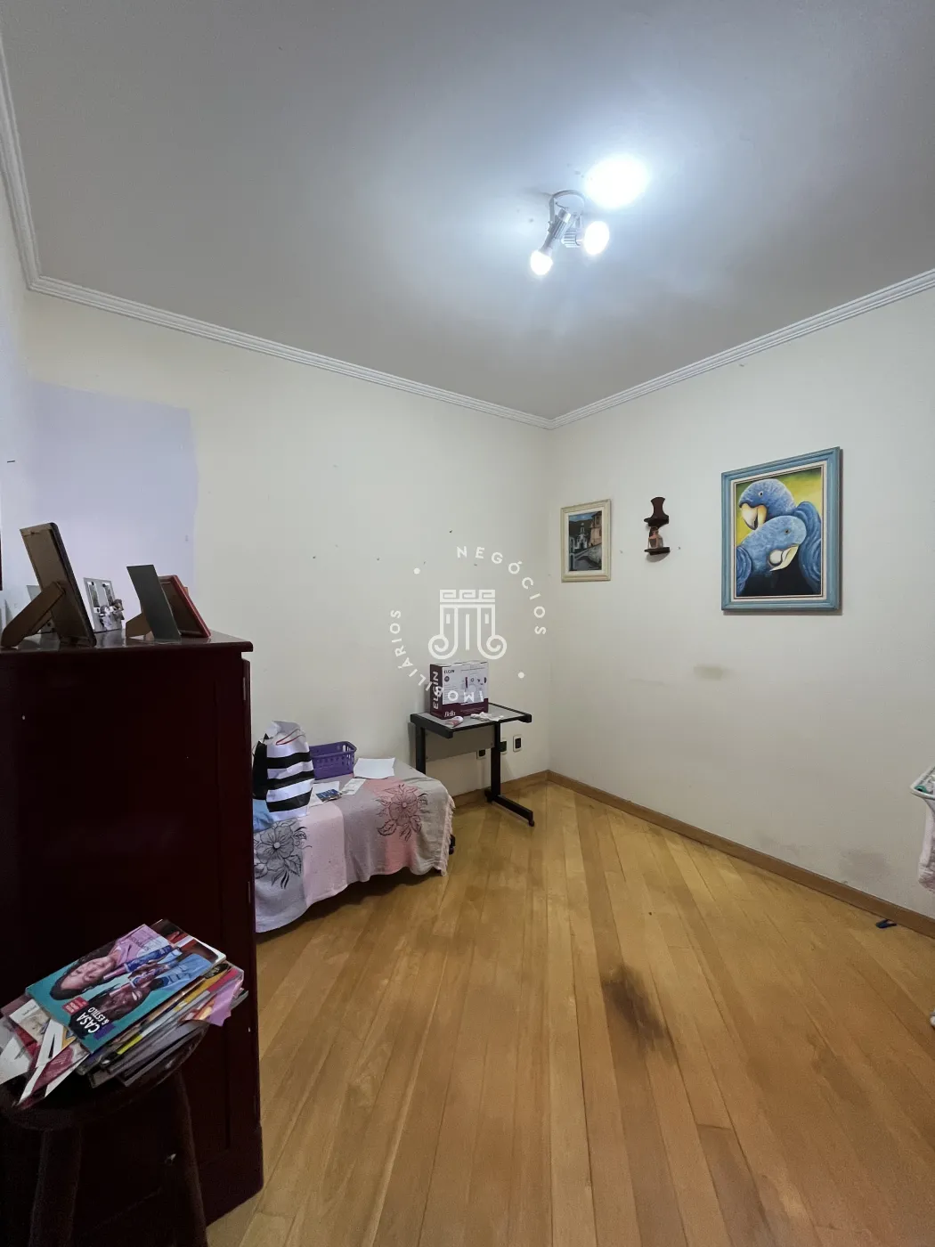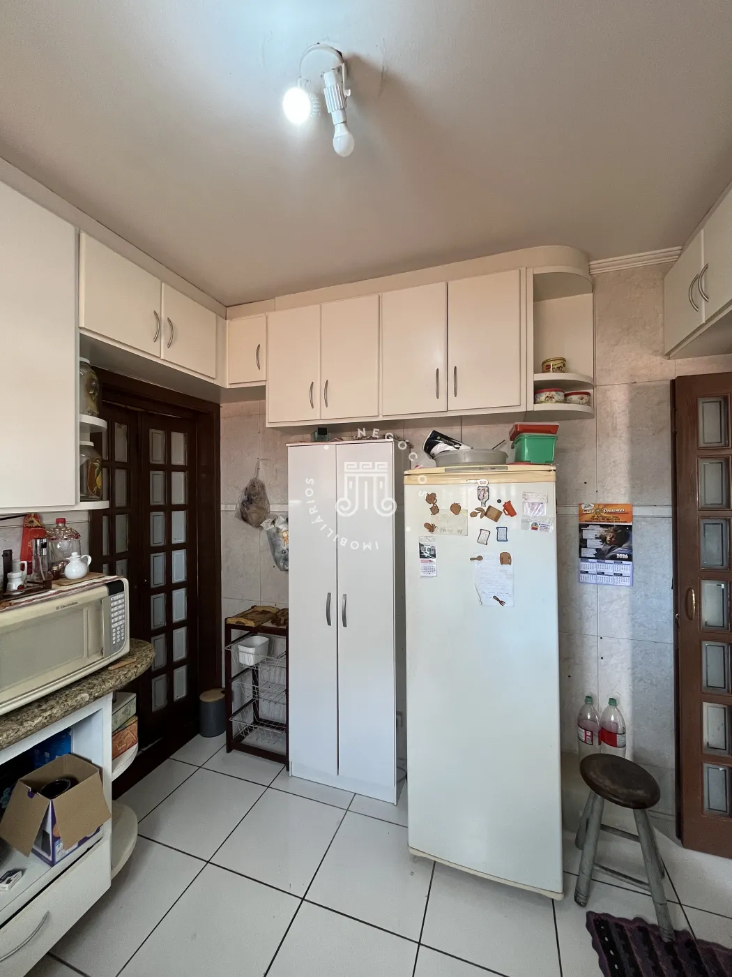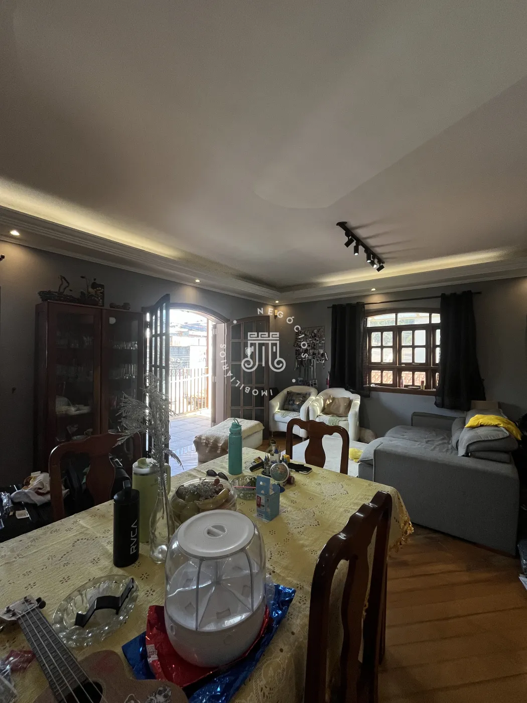 No piso superior está a residência, composta por 3 dormitórios, sendo 2 suítes, além de banheiro social e lavabo. A área interna inclui cozinha com armários planejados, lavanderia, sala de estar e sala de jantar com piso em carpete de madeira. O imóvel conta com porta de aço e portão eletrônico. Há varanda em toda a lateral da casa, atendendo a sala de estar, a sala de jantar e a suíte principal.