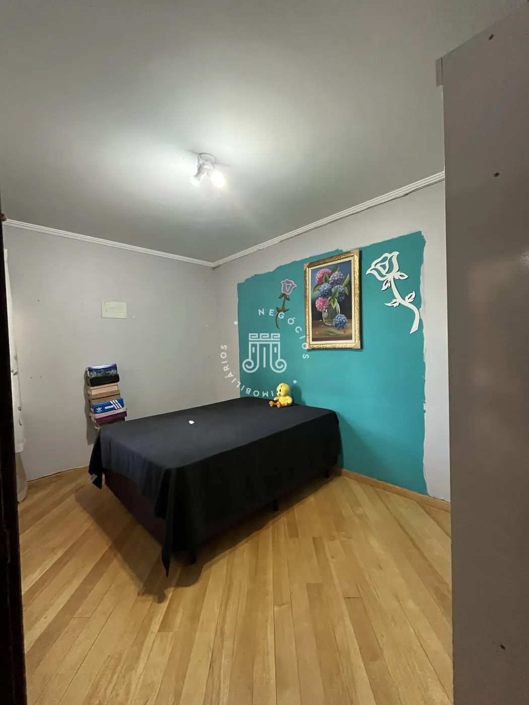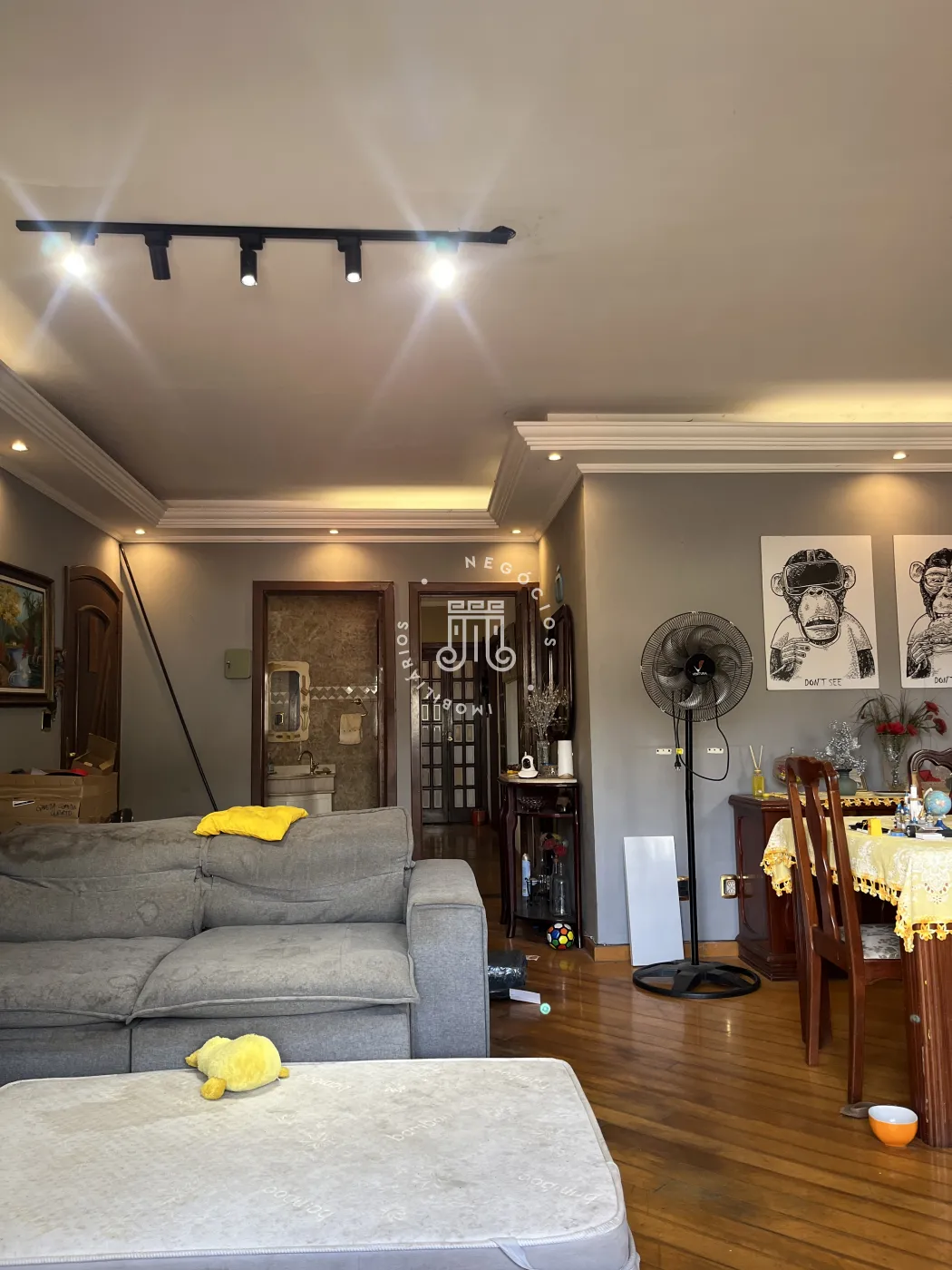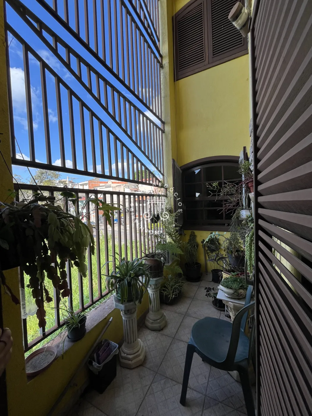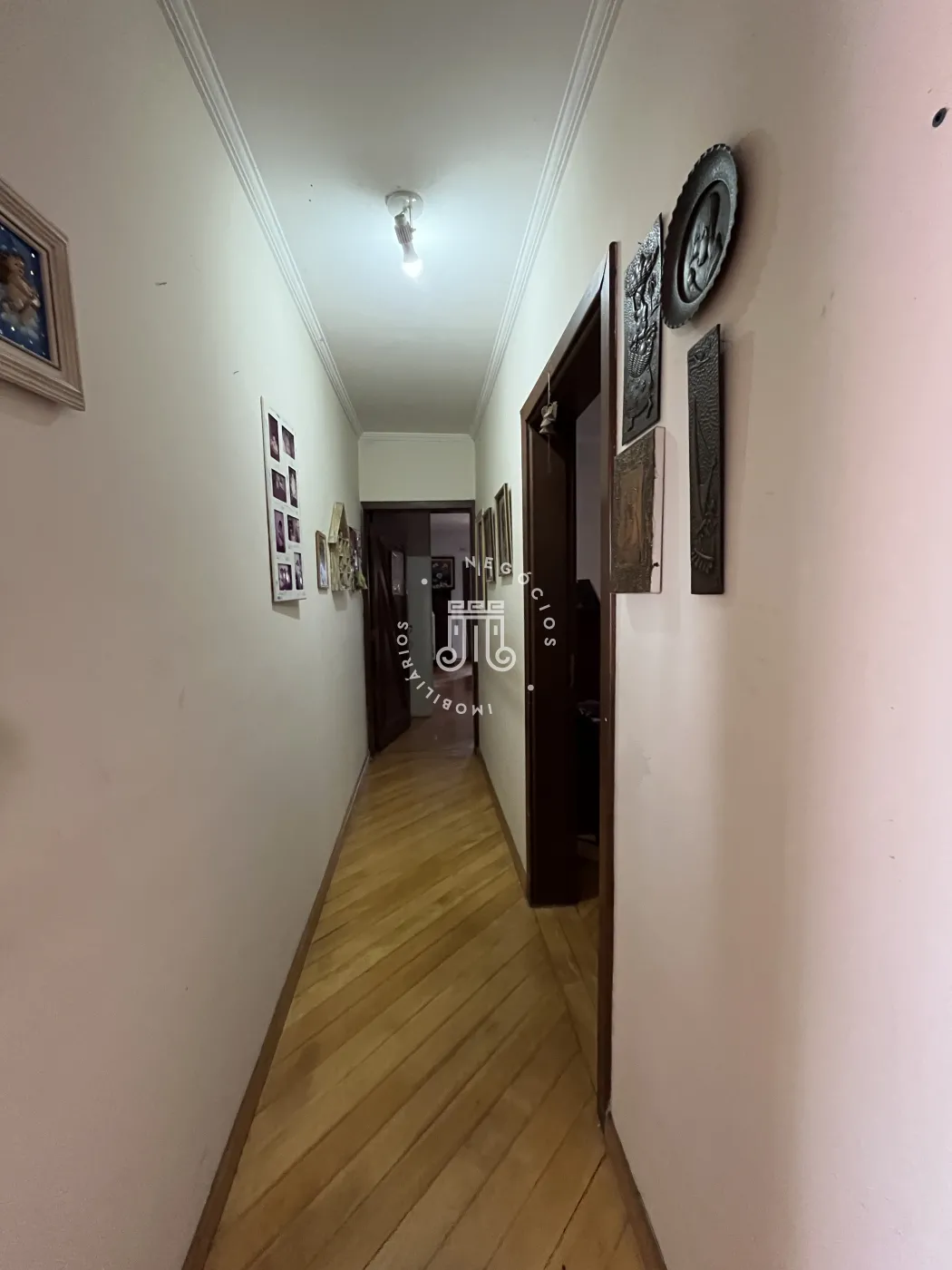No piso superior está a residência, composta por 3 dormitórios, sendo 2 suítes, além de banheiro social e lavabo. A área interna inclui cozinha com armários planejados, lavanderia, sala de estar e sala de jantar com piso em carpete de madeira. O imóvel conta com porta de aço e portão eletrônico. Há varanda em toda a lateral da casa, atendendo a sala de estar, a sala de jantar e a suíte principal.