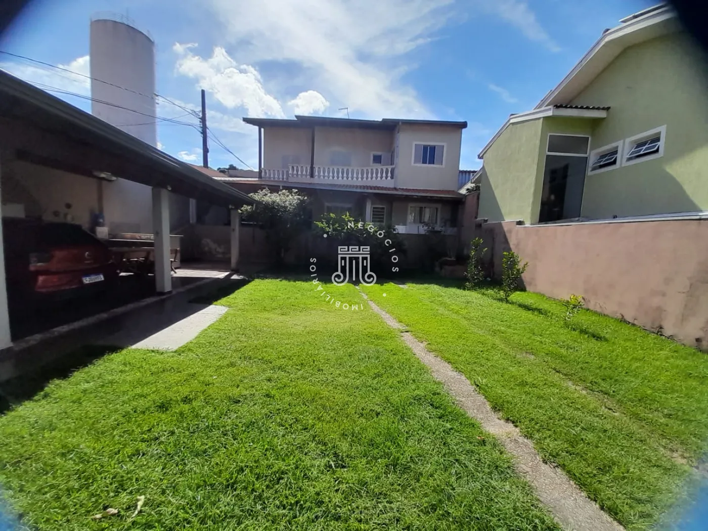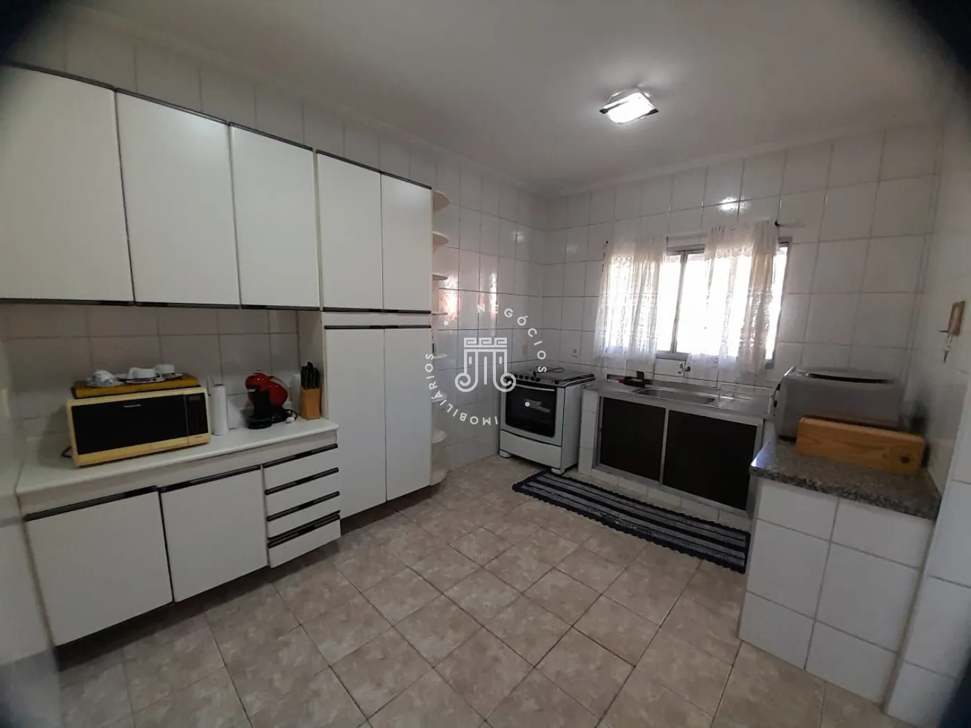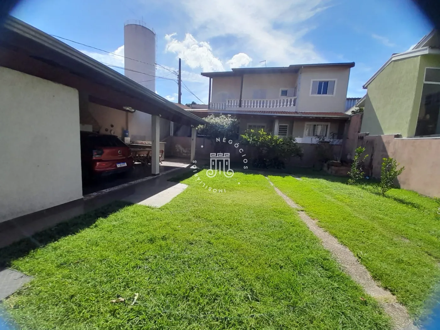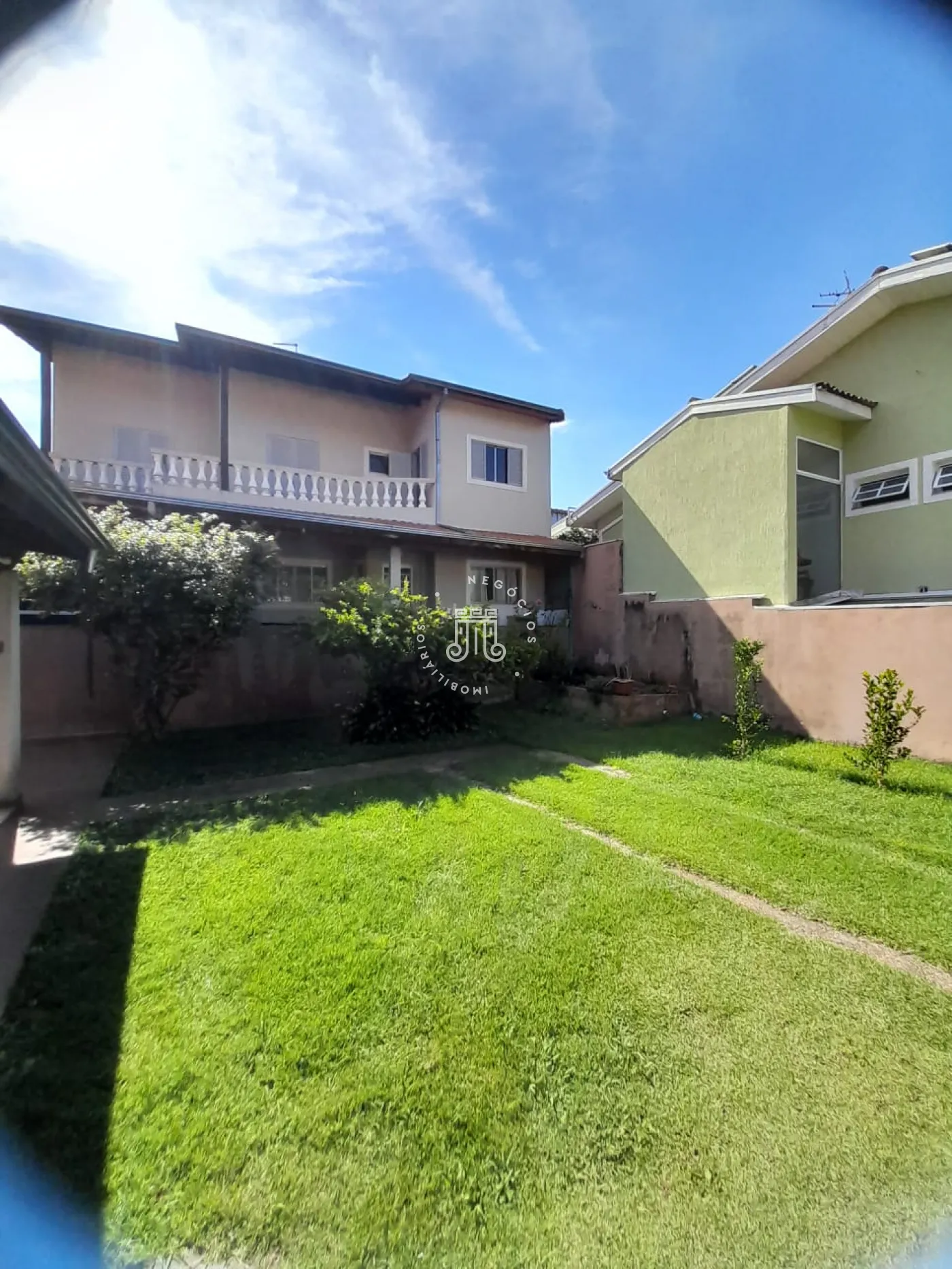 Com 214m² de área construída, possui 3 dormitórios, todos com sacada, sala com 2 ambientes: jantar e estar, cozinha com armários, 2 banheiros, lavanderia, área gourmet com churrasqueira e banheiro, quarto de despejo, terreno grande e gramado, onde podem estacionar 12 carros, canil