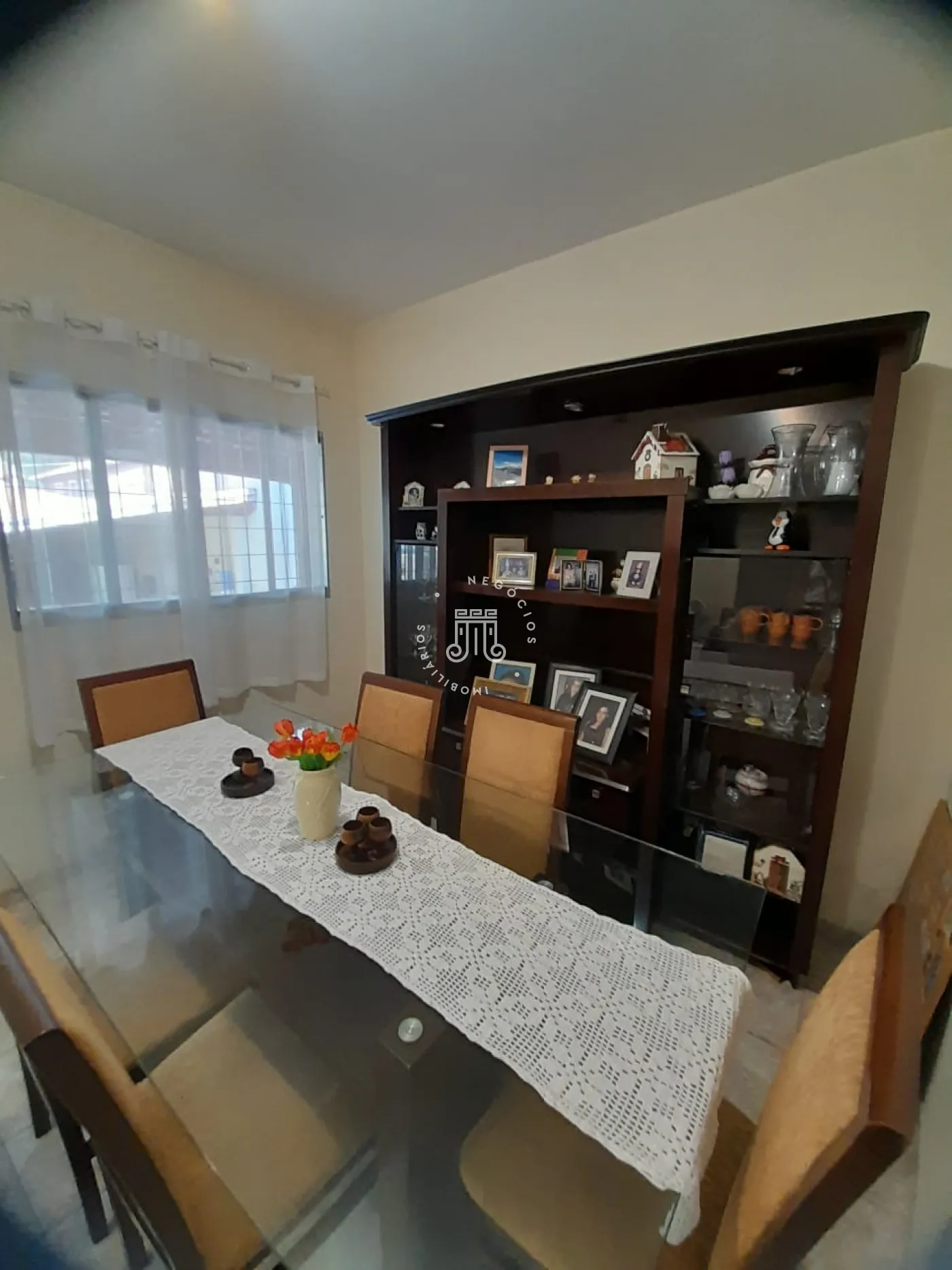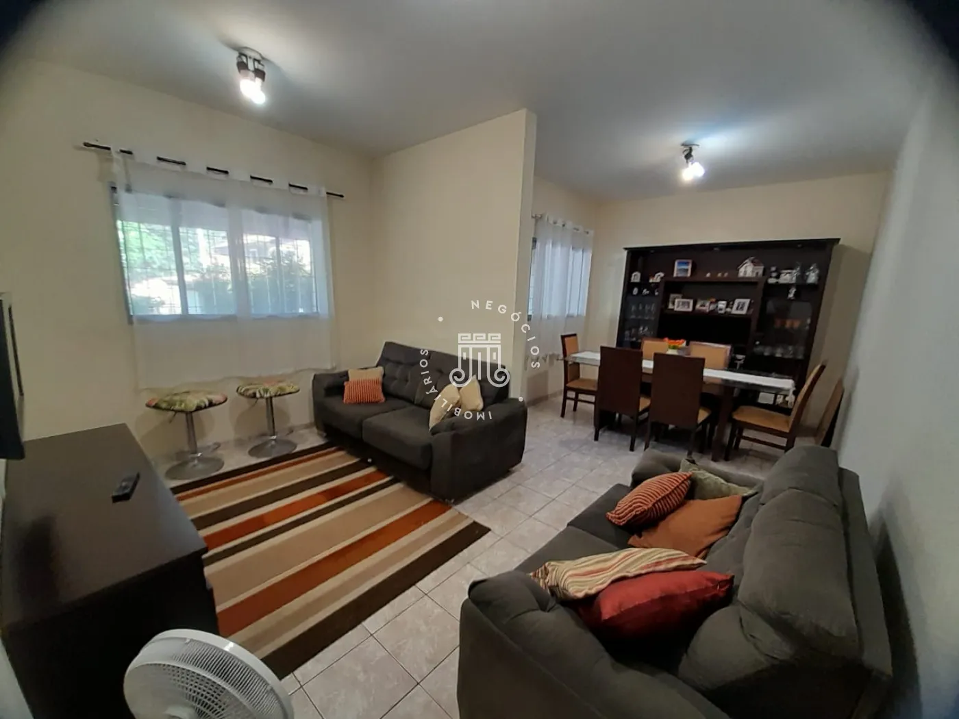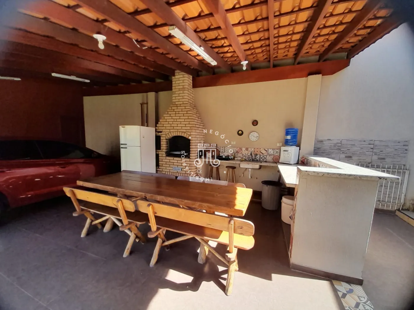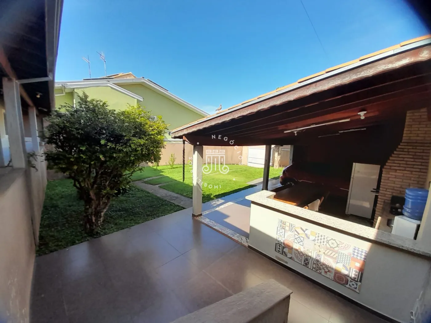 Com 214m² de área construída, possui 3 dormitórios, todos com sacada, sala com 2 ambientes: jantar e estar, cozinha com armários, 2 banheiros, lavanderia, área gourmet com churrasqueira e banheiro, quarto de despejo, terreno grande e gramado, onde podem estacionar 12 carros, canil