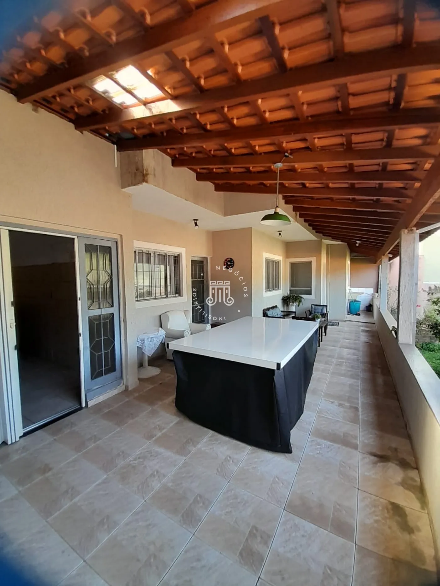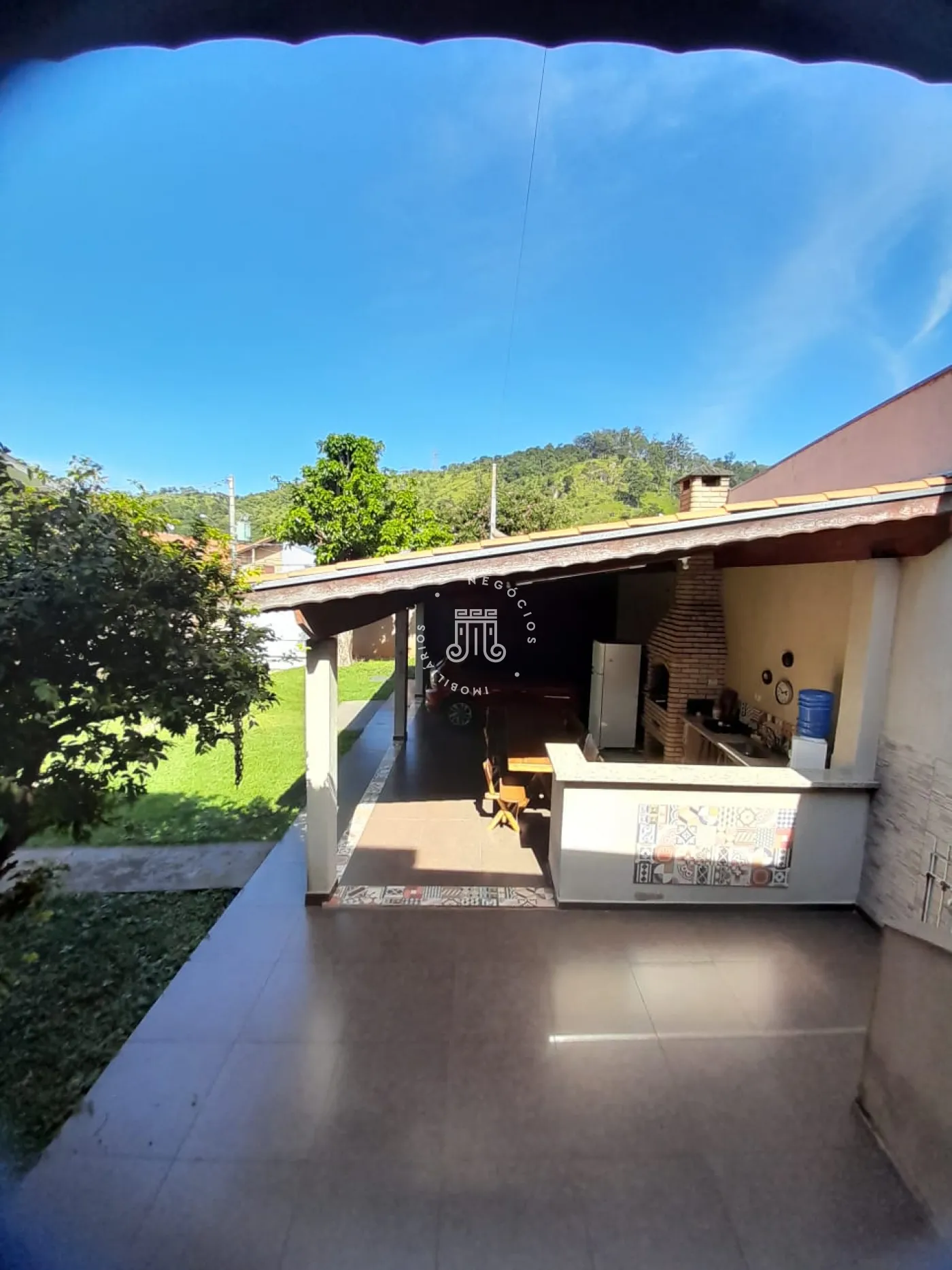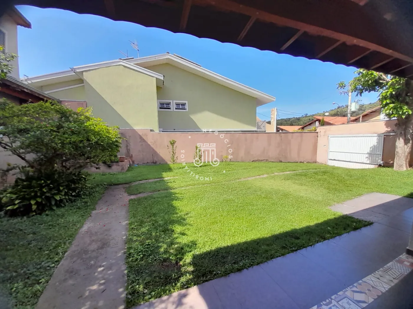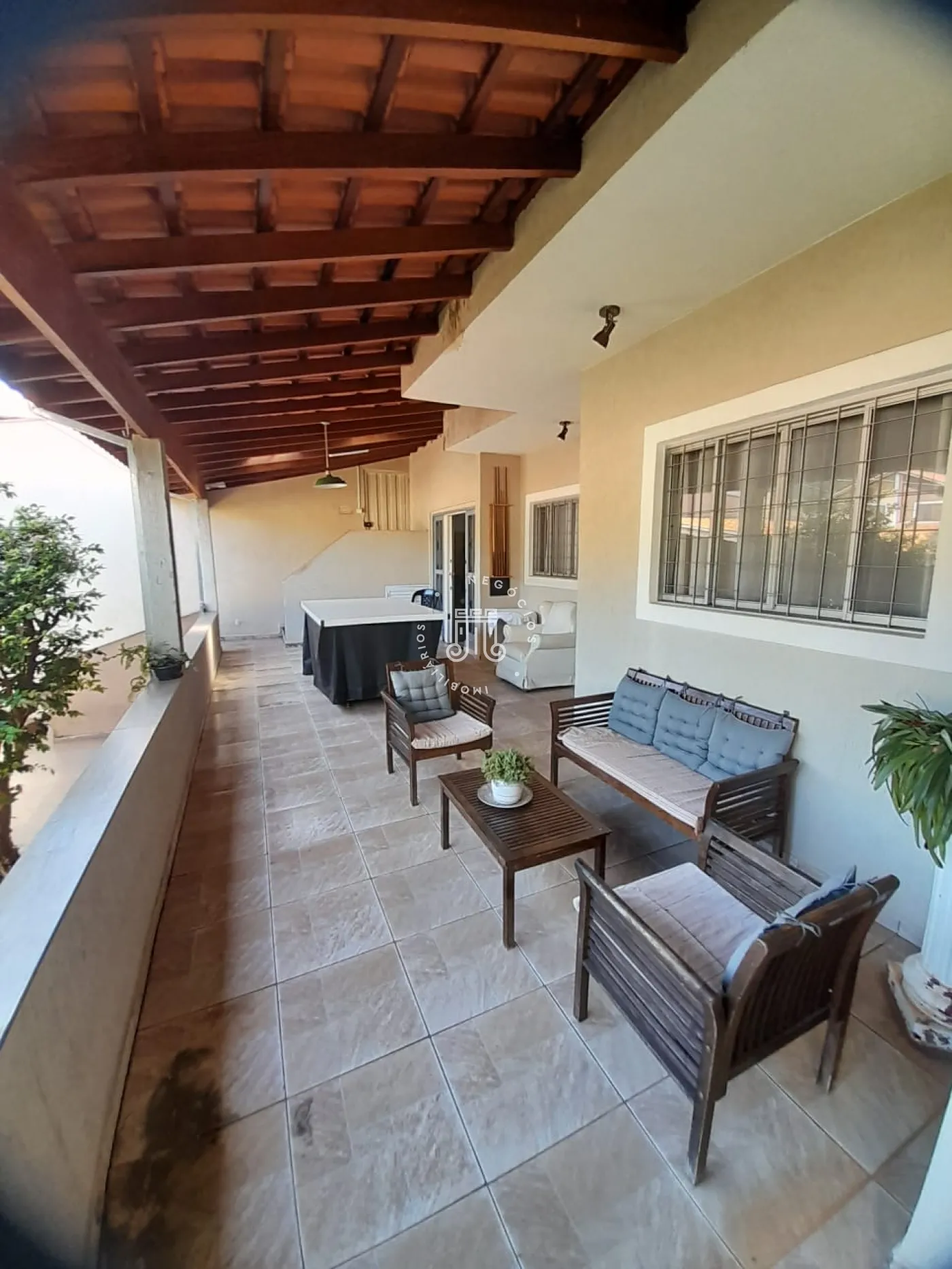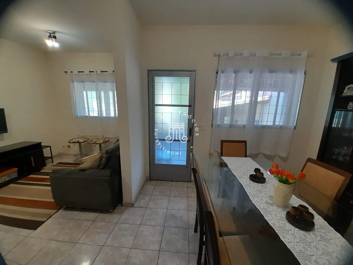 Com 214m² de área construída, possui 3 dormitórios, todos com sacada, sala com 2 ambientes: jantar e estar, cozinha com armários, 2 banheiros, lavanderia, área gourmet com churrasqueira e banheiro, quarto de despejo, terreno grande e gramado, onde podem estacionar 12 carros, canil