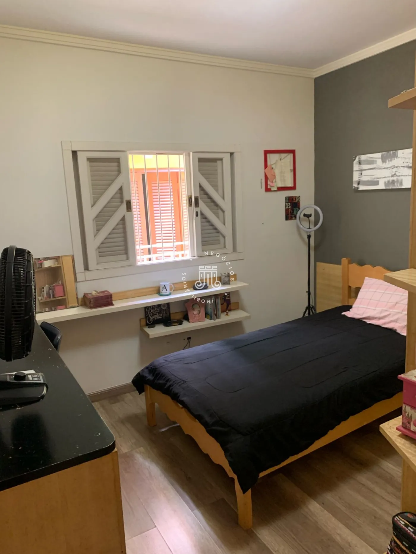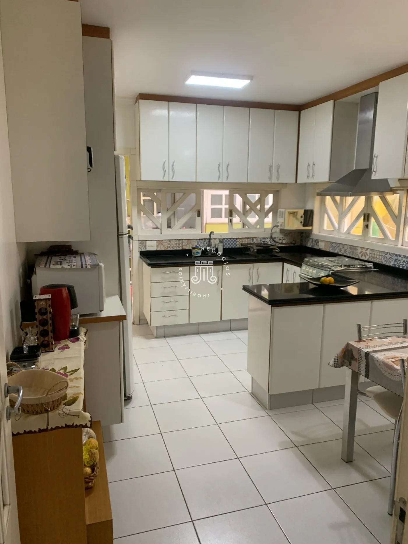 Casa com 221 m², 3 quartos com 1 suíte cada quarto, sala, cozinha, área de serviço, garagem para 2 carros, 1 banheiro de visita, varanda em um dos quartos, quintal com edícula no fundo com 1 quarto, 1 banheiro e uma cozinha.