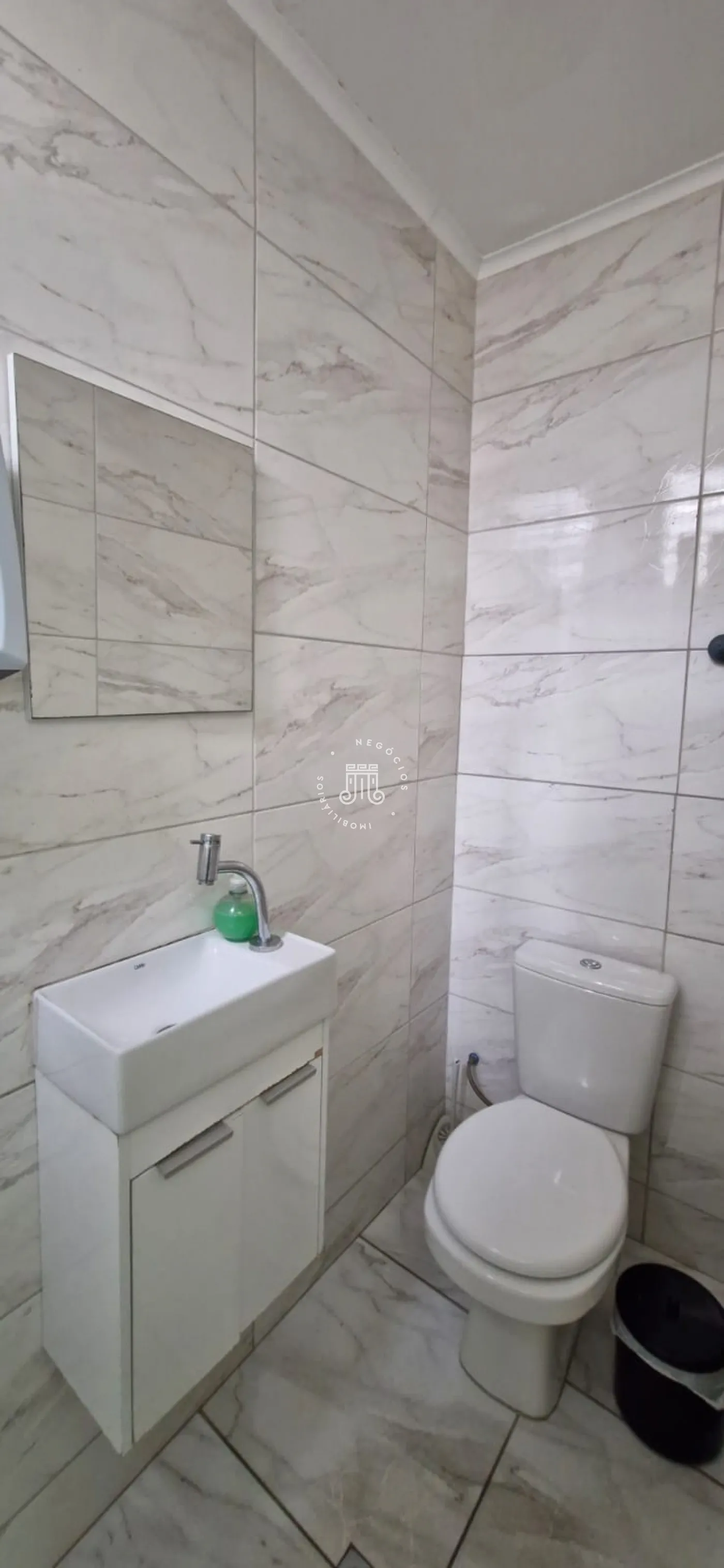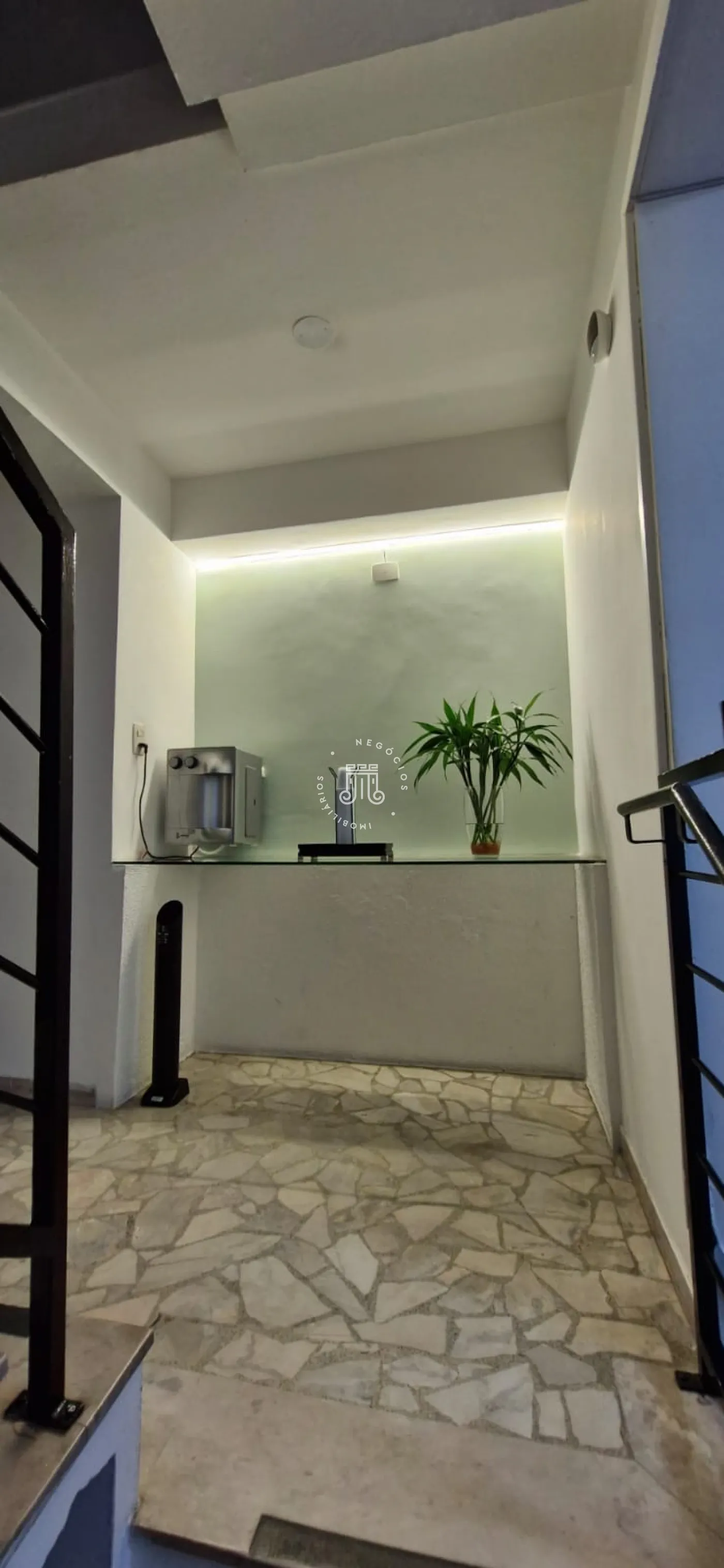 Portaria com interfone e portão eletrônico. Na parte inferior, tem uma recepção espaçosa, 2 salas, espaço para uma pequena copa/café. Cozinha com pia, armários, uma copa e banheiro. Pequeno quintal nos fundos (área de serviço).