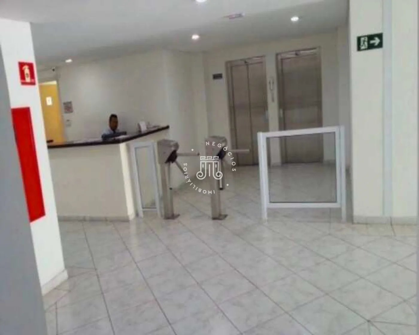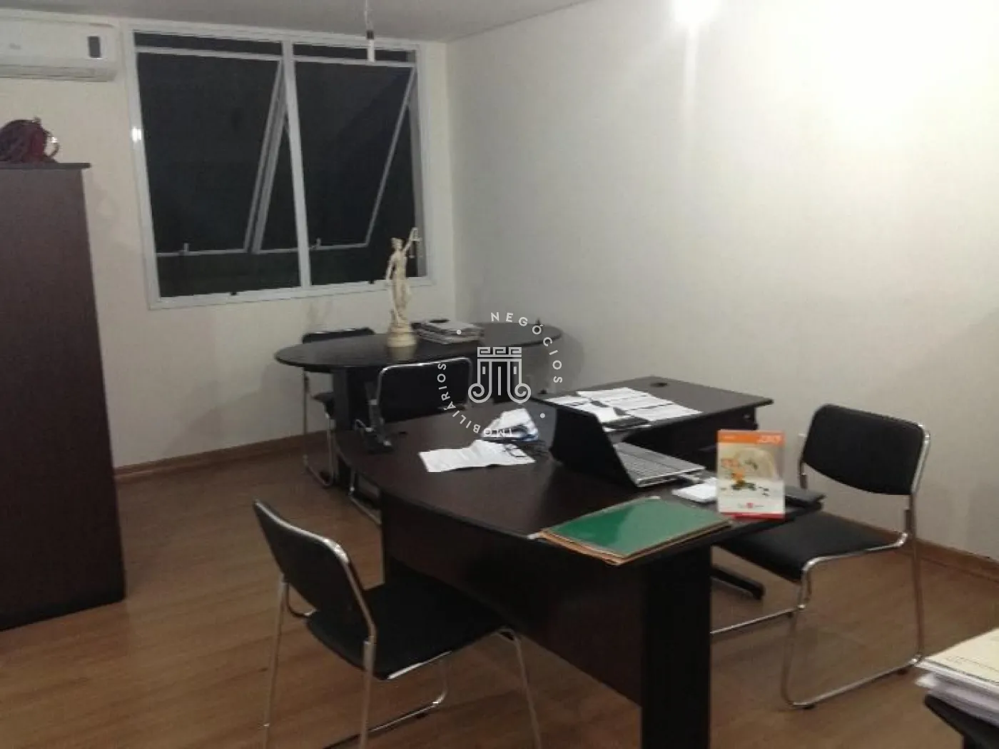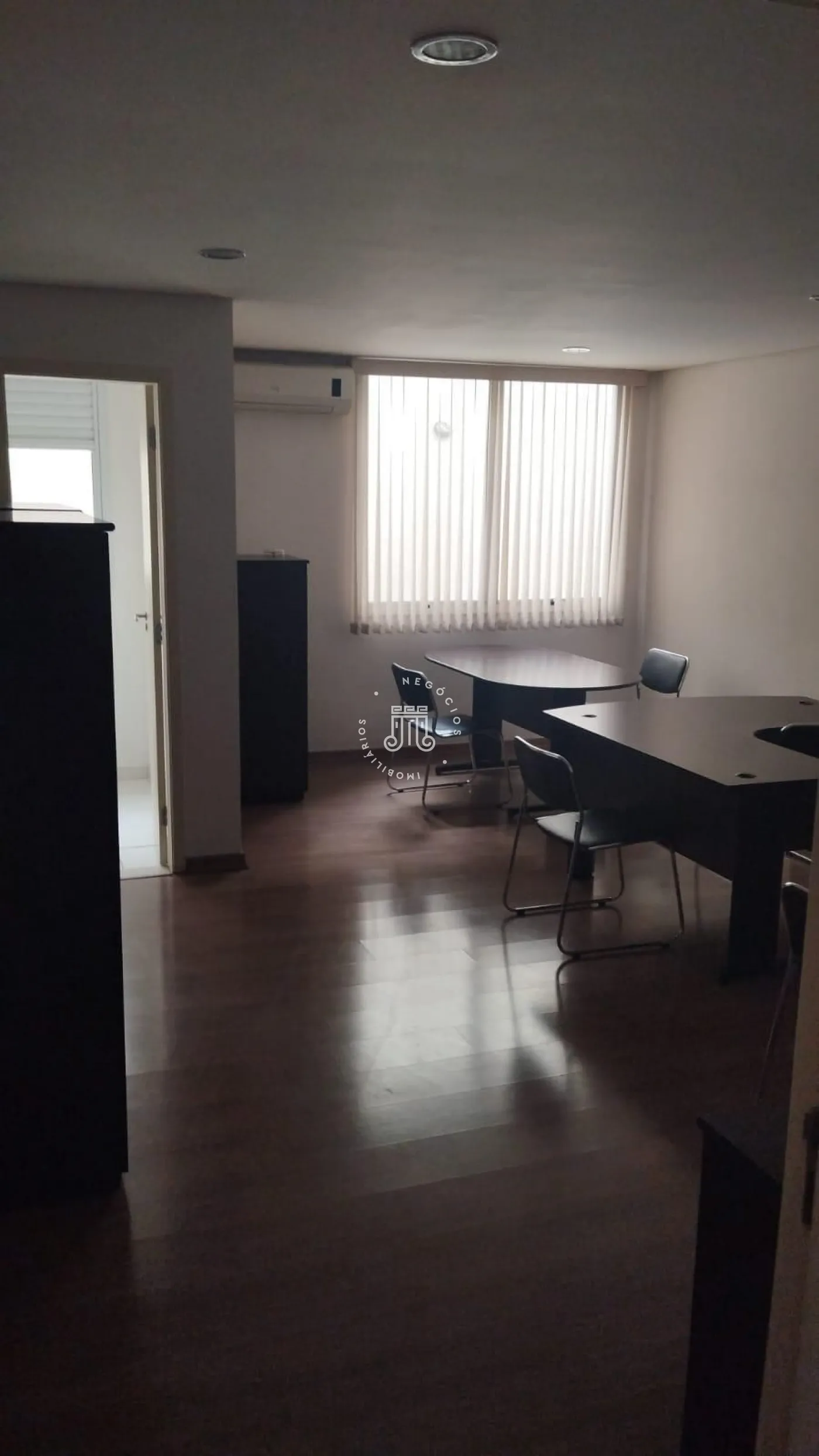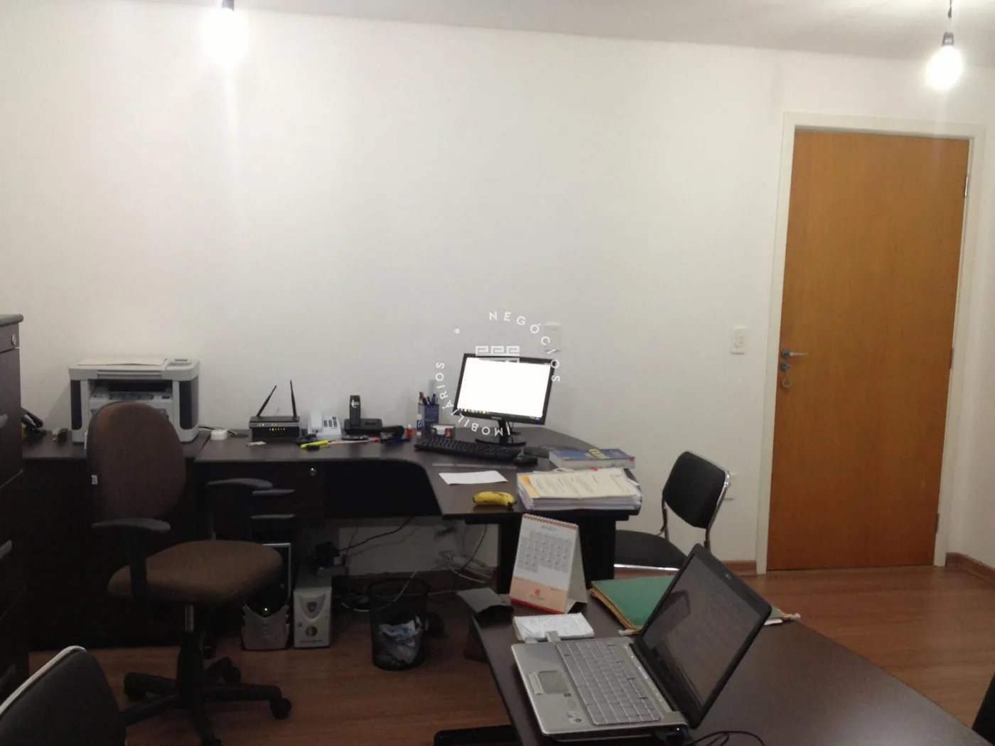 A sala conta com um banheiro, mobília como mesas, cadeiras e armários, ar condicionado e 1 vaga.