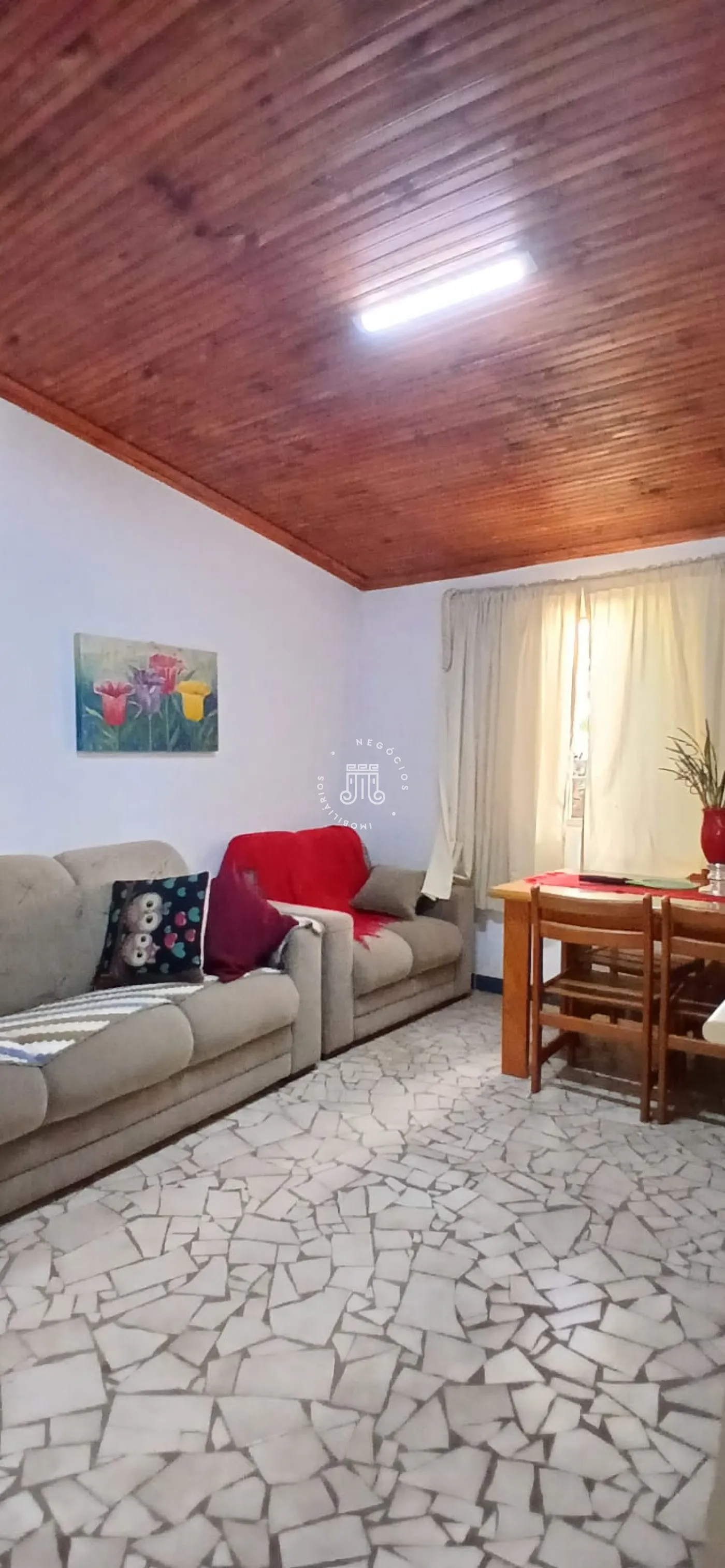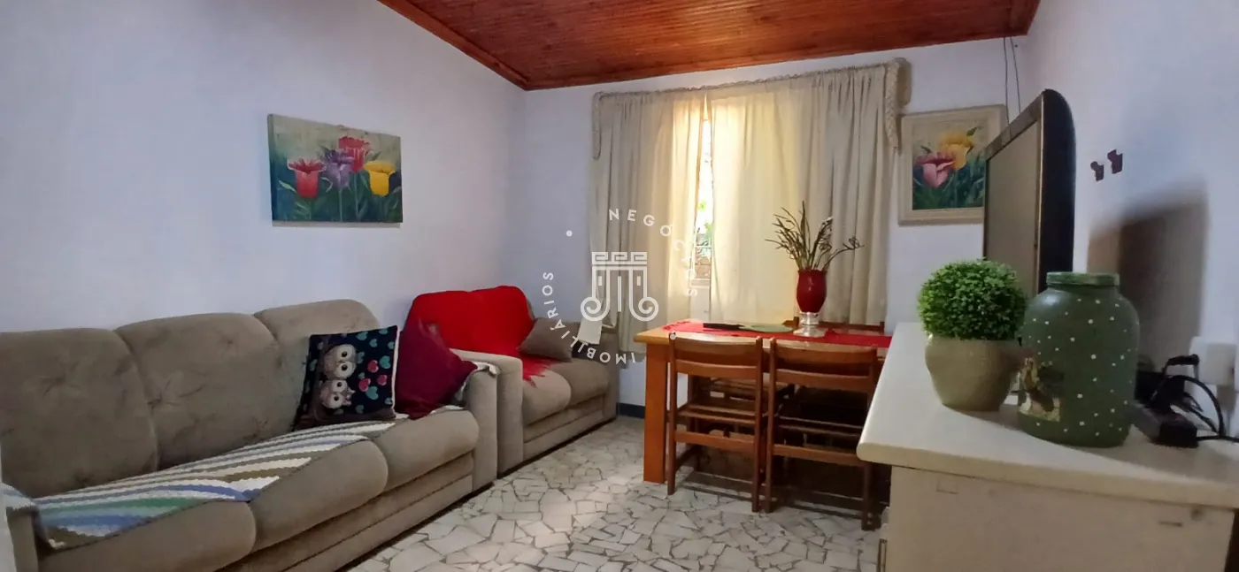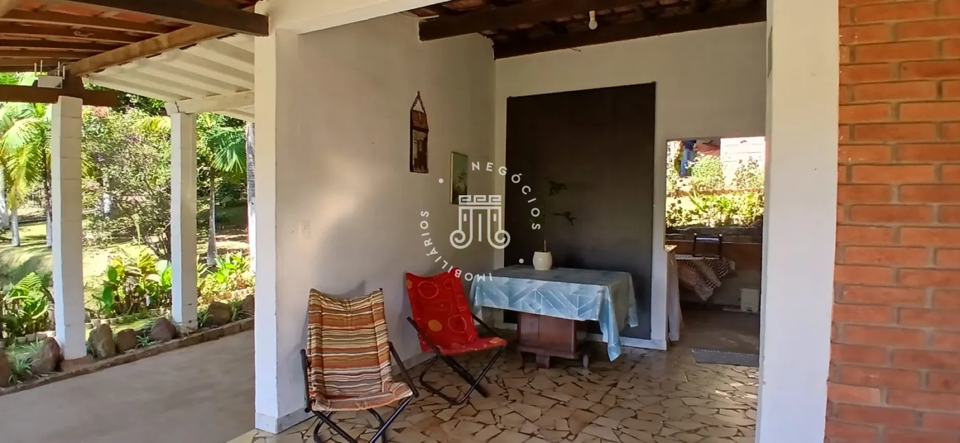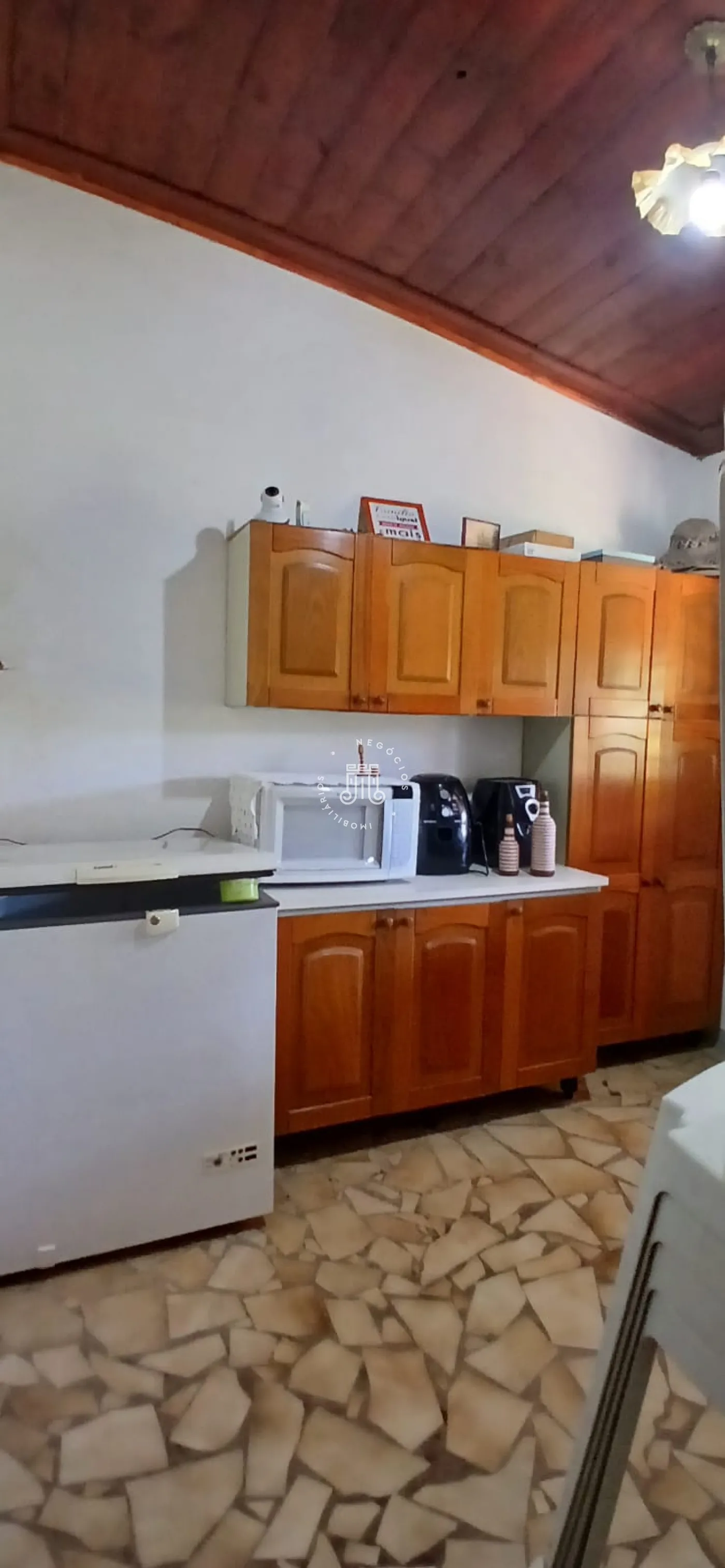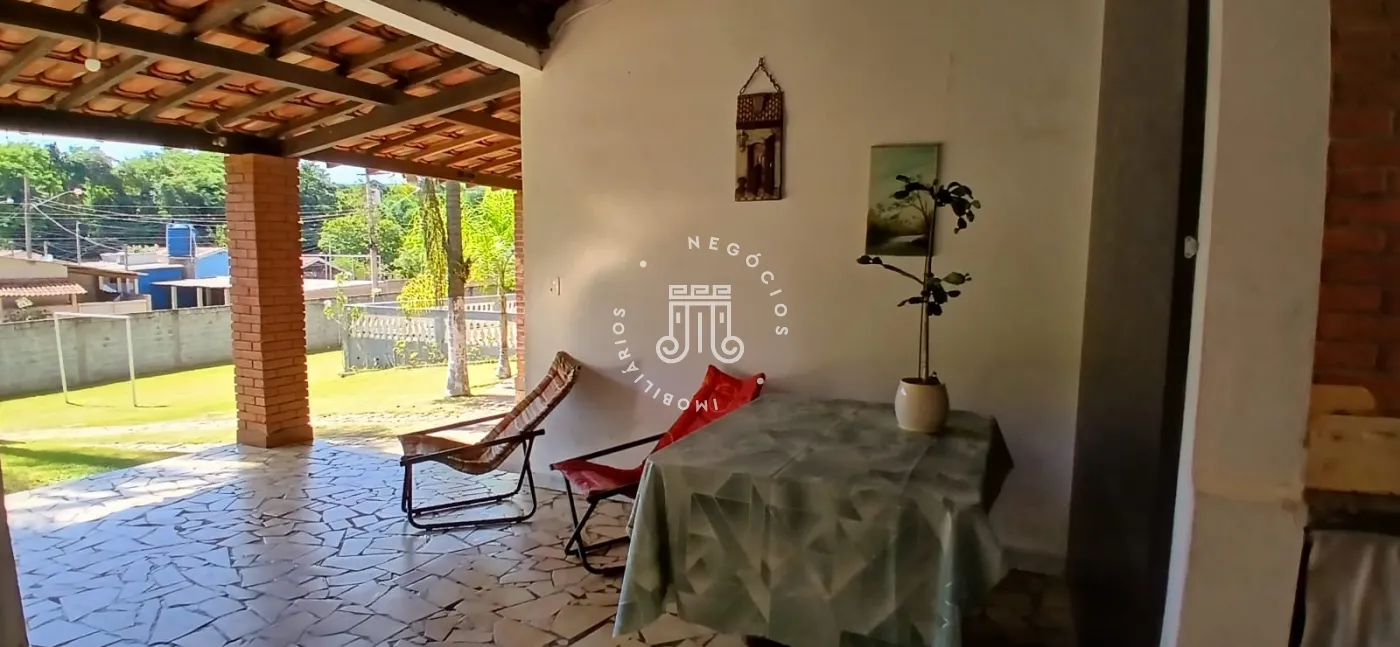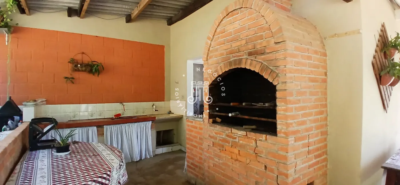 A construção principal conta com laje e cobertura em telha de barro e fibrocimento, além de uma entrada coberta com telha portuguesa. O espaço é gramado e inclui uma residência com dois quartos, sendo um suíte, um banheiro social, cozinha, sala de estar e TV, lavanderia e varanda coberta. A área gourmet possui churrasqueira e fica anexa à casa. Há duas vagas de garagem cobertas e espaço para estacionamento descoberto. Um depósito também está presente no terreno.