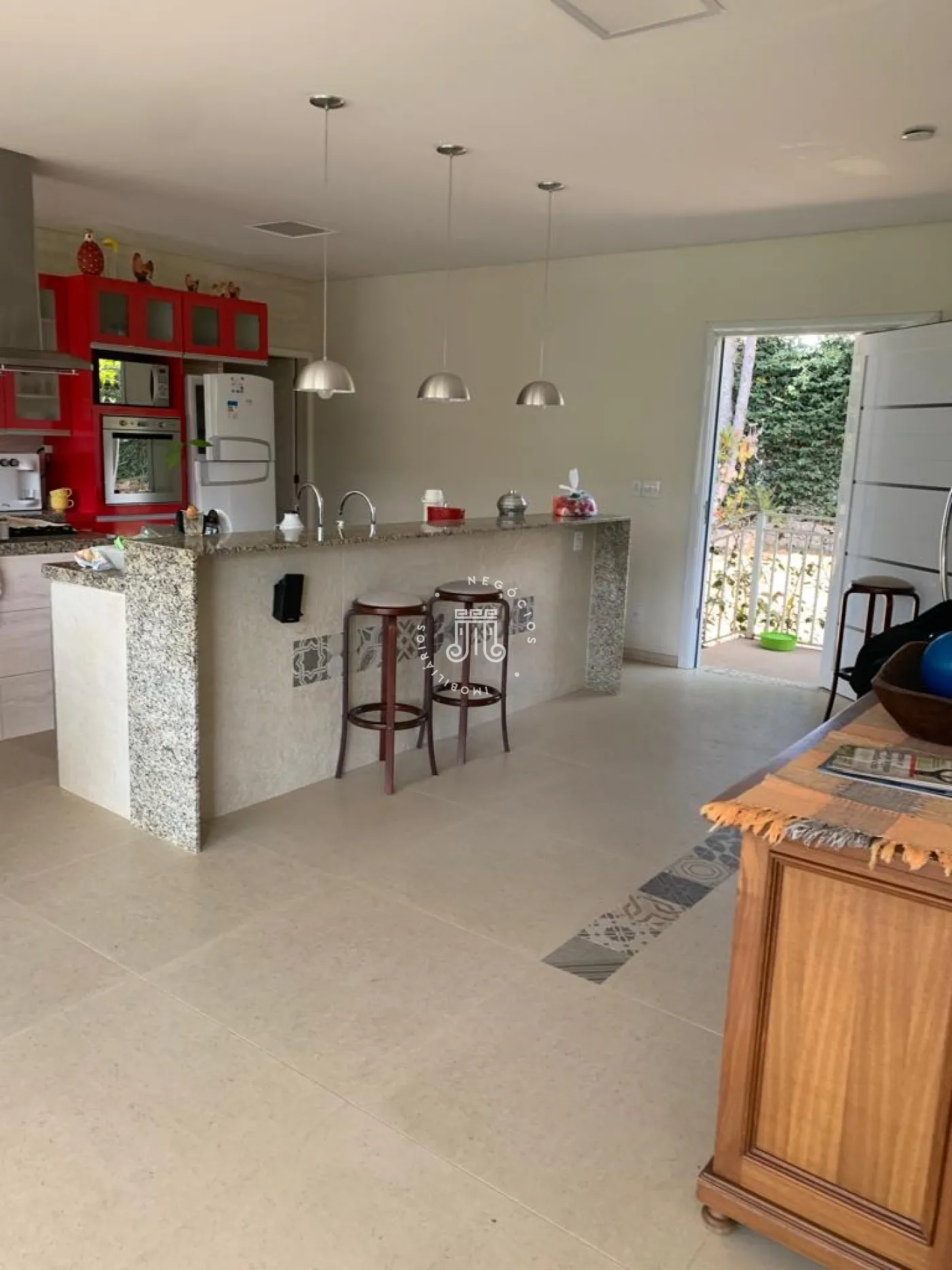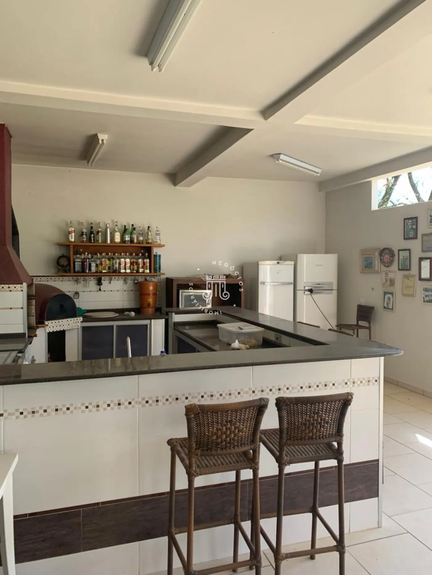 Cozinha com copa de 100 m² com ar condicionado, planejada, com armários, bar, varanda, lareira, ambiente TV, adega.
