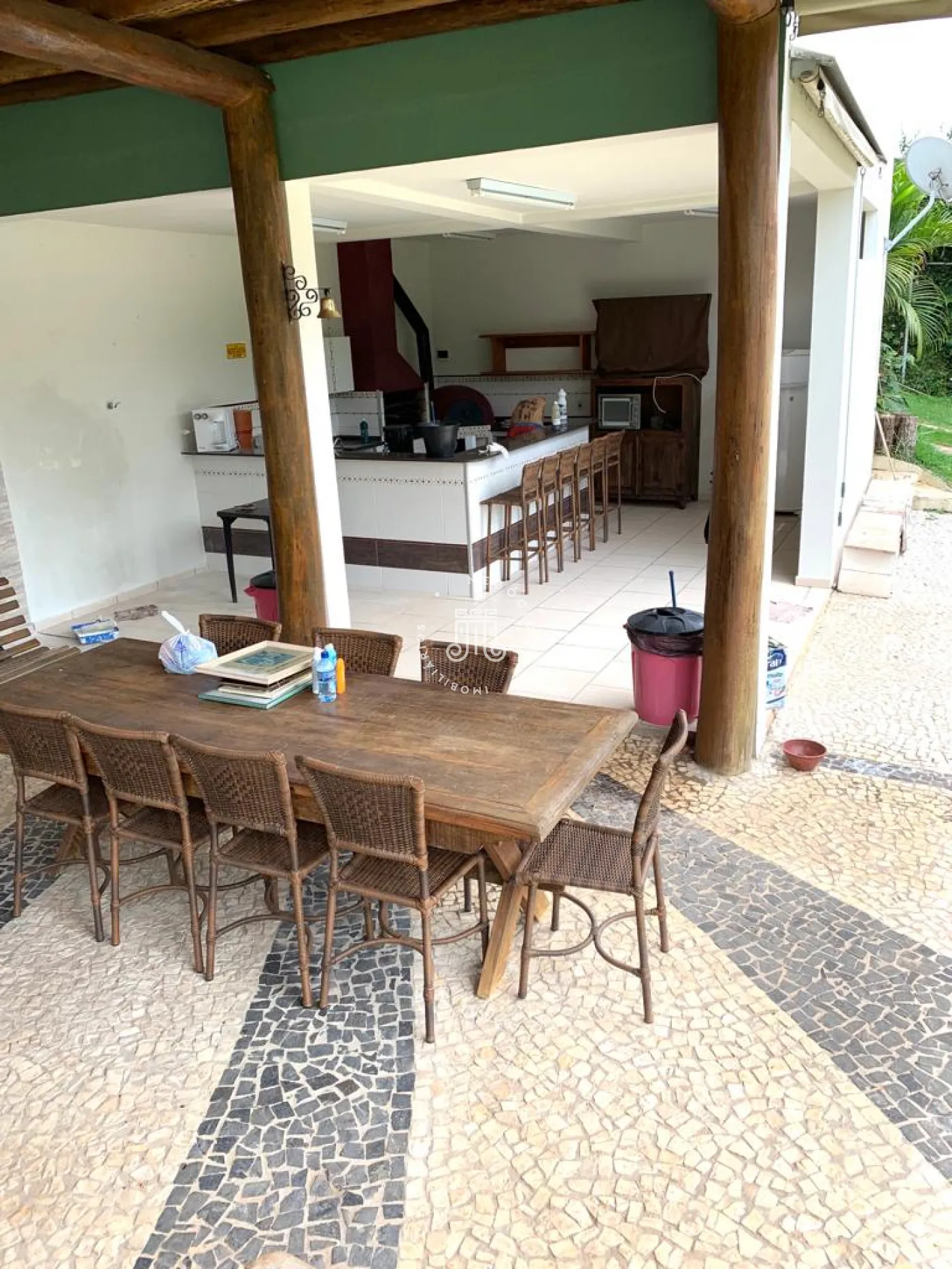 Depósito ferramentas, banheiro empregada, lavabo, área de serviço, despensa, parreira, churrasqueira, forno a lenha, parque infantil.