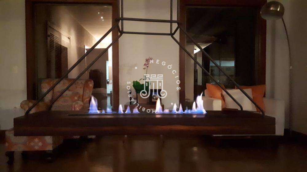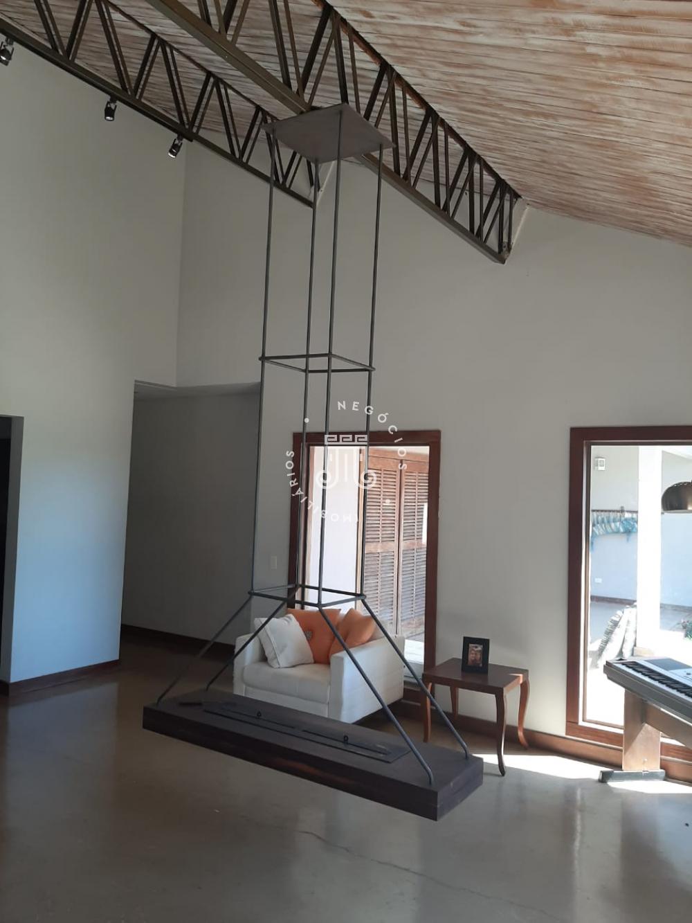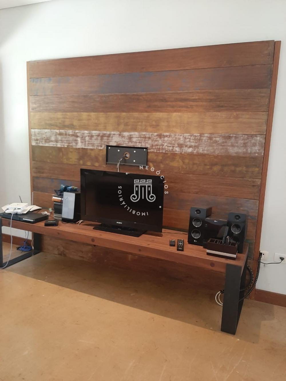 O espaço gourmet possui churrasqueira, forno e fogão a lenha, além de uma mesa antiga de três metros. O deck suspenso conta com uma piscina de vinil com capacidade para 30 mil litros e um fogo de chão. Toda a área íntima e social é voltada para o deck, a piscina e a vista da Serra do Japi.