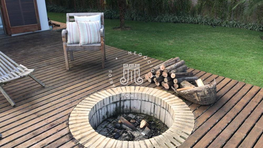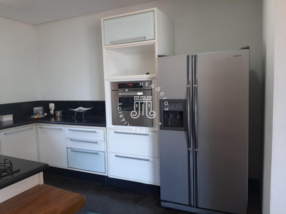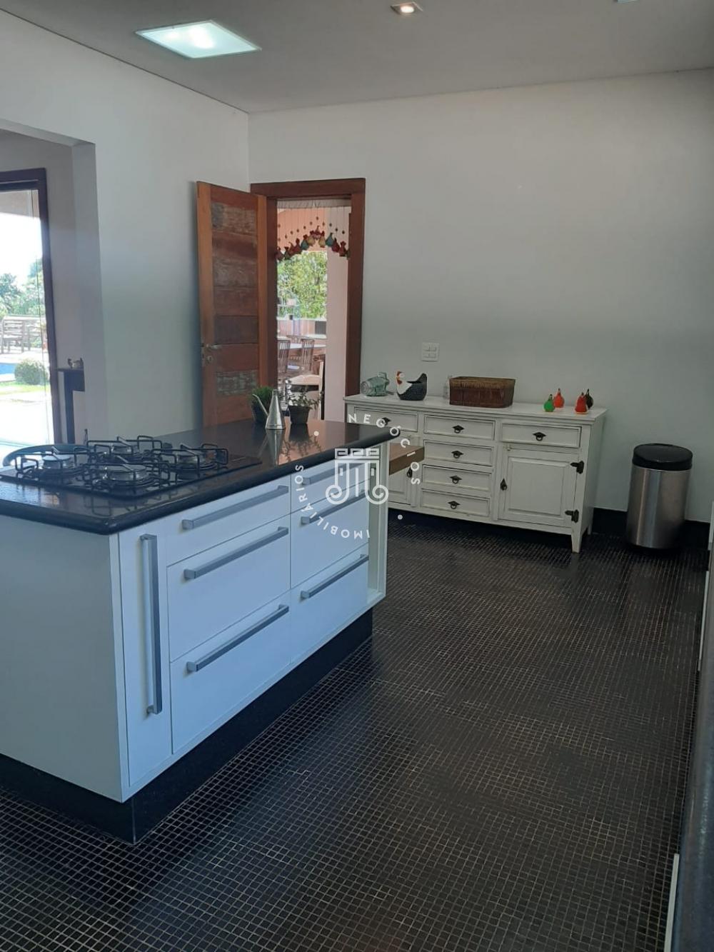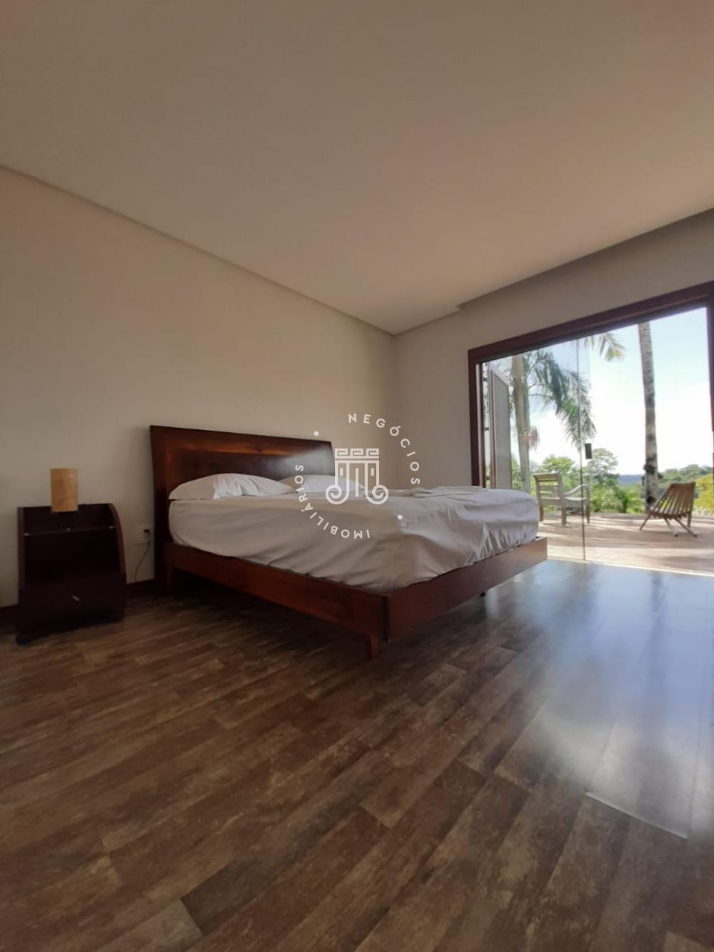 O espaço gourmet possui churrasqueira, forno e fogão a lenha, além de uma mesa antiga de três metros. O deck suspenso conta com uma piscina de vinil com capacidade para 30 mil litros e um fogo de chão. Toda a área íntima e social é voltada para o deck, a piscina e a vista da Serra do Japi.