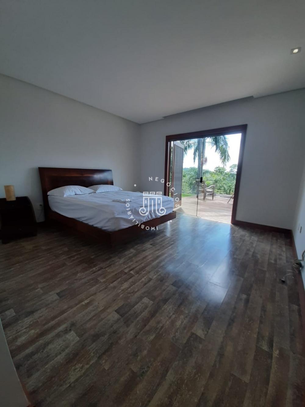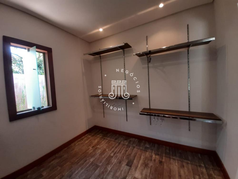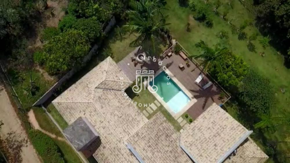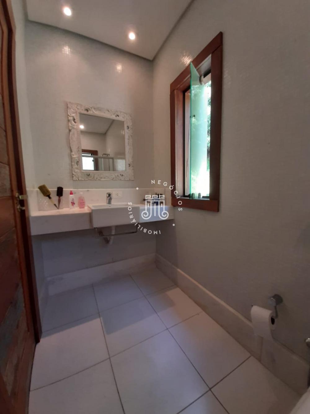 A casa tem 312 m² de área construída e conta com três dormitórios, sendo um deles uma suíte máster com closet. A sala social e a de jantar estão no mesmo ambiente, com uma lareira suspensa ecológica e um home theater. A cozinha possui uma ilha. O imóvel dispõe de dois banheiros sociais, sendo um deles ainda não montado, além de lavanderia e área de serviço. Há também um dormitório e um banheiro próximos à piscina.