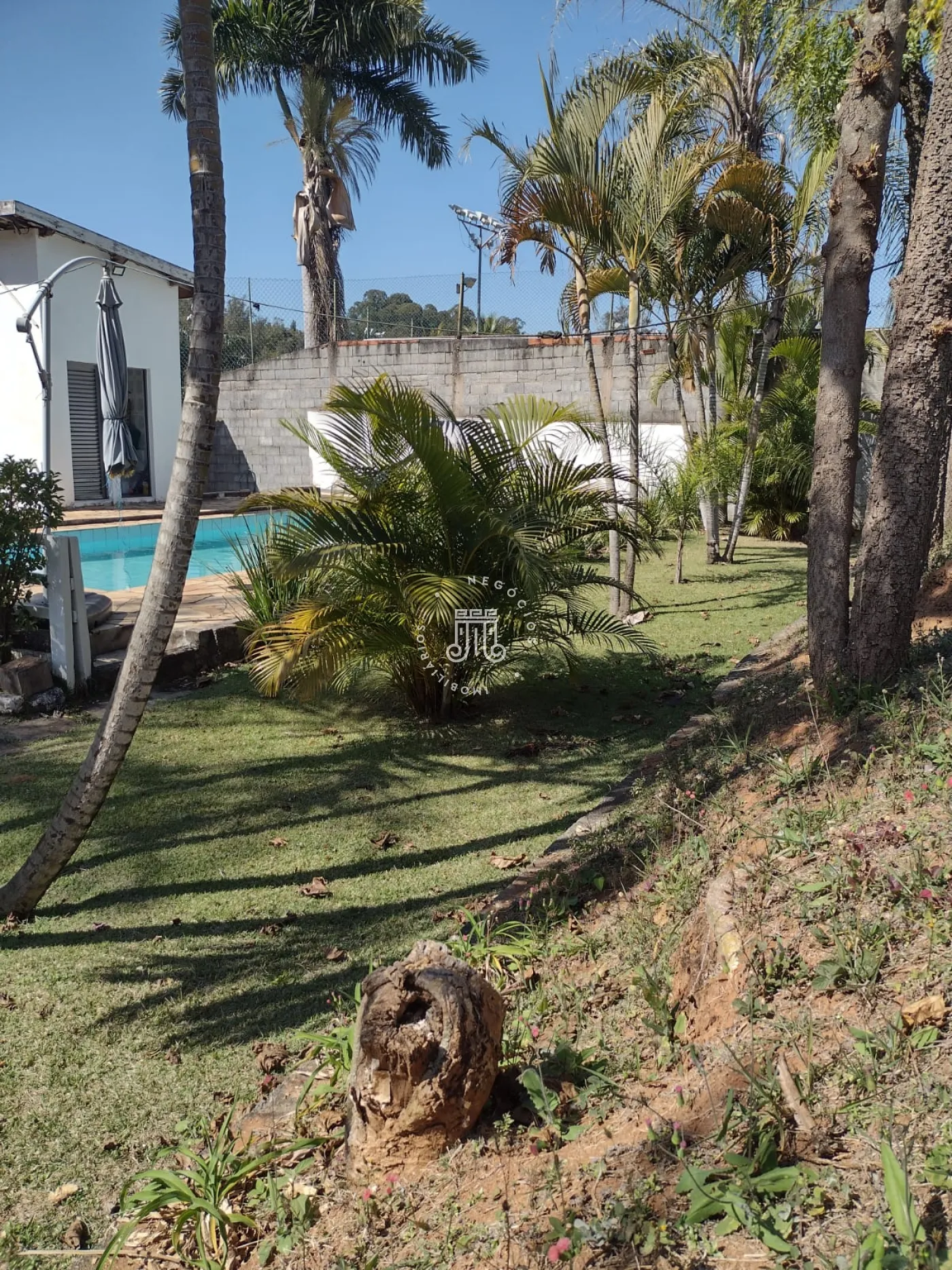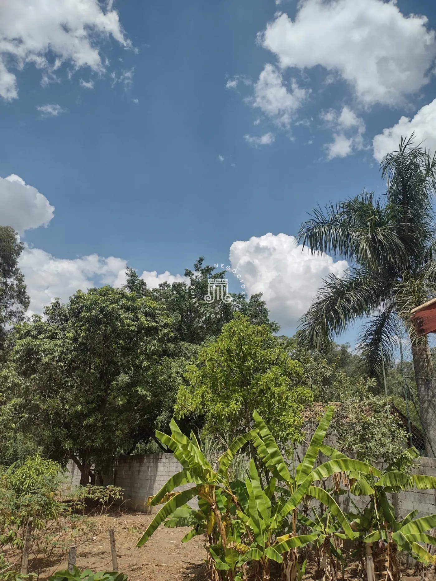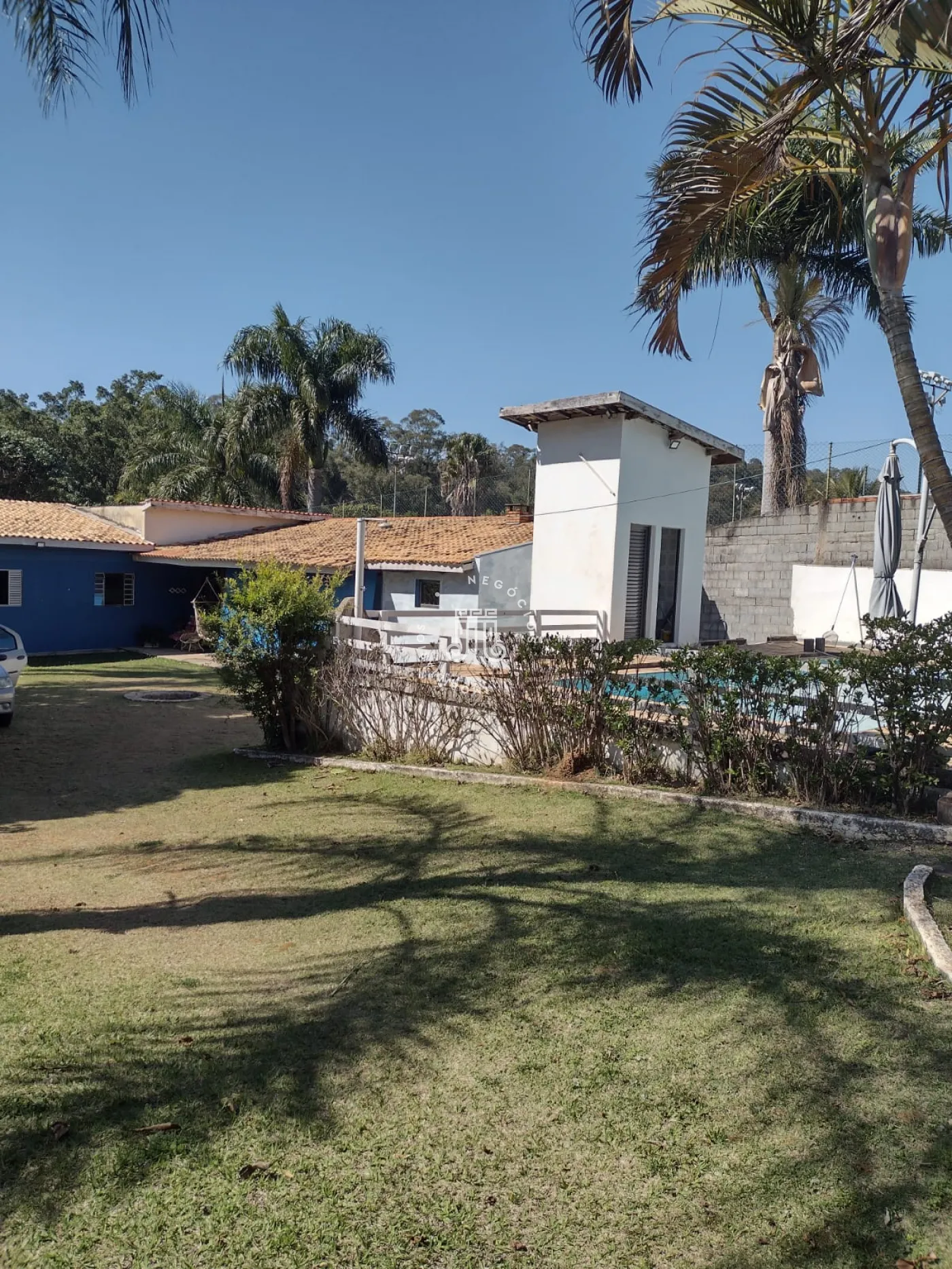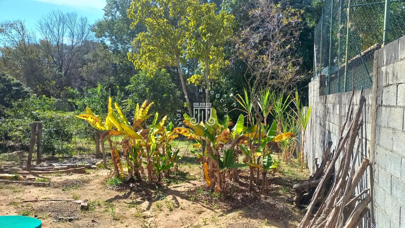 A área externa possui pomar formado com espécies como figo, jabuticaba, laranja, mexerica, limão, abacate, manga e banana. A chácara dispõe de dez vagas para estacionamento.