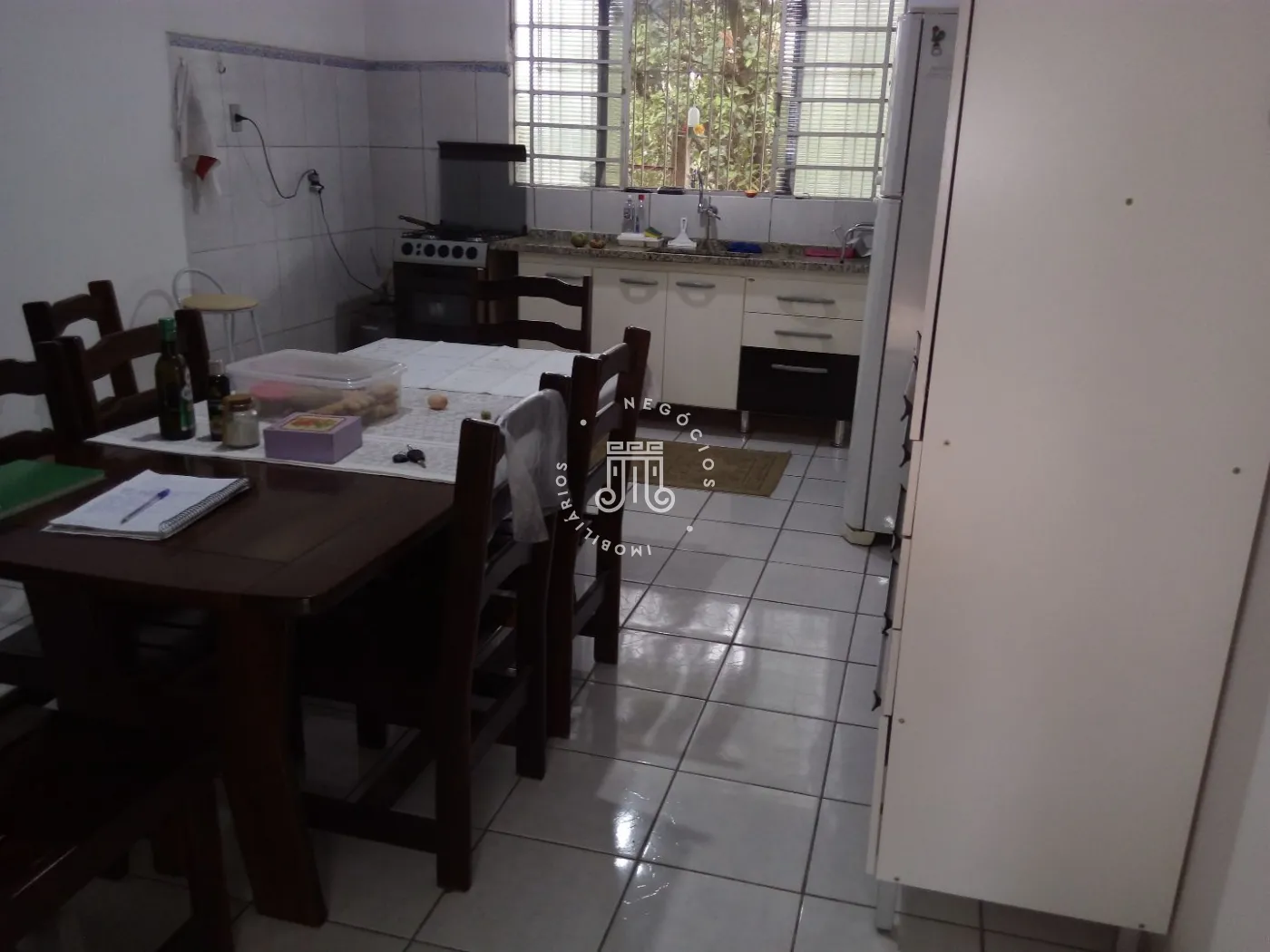 A construção principal conta com laje e cobertura em telha de barro e fibrocimento, além de uma entrada coberta com telha portuguesa. O espaço é gramado e inclui uma residência com dois quartos, sendo um suíte, um banheiro social, cozinha, sala de estar e TV, lavanderia e varanda coberta. A área gourmet possui churrasqueira e fica anexa à casa. Há duas vagas de garagem cobertas e espaço para estacionamento descoberto. Um depósito também está presente no terreno.