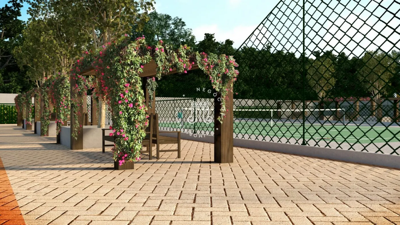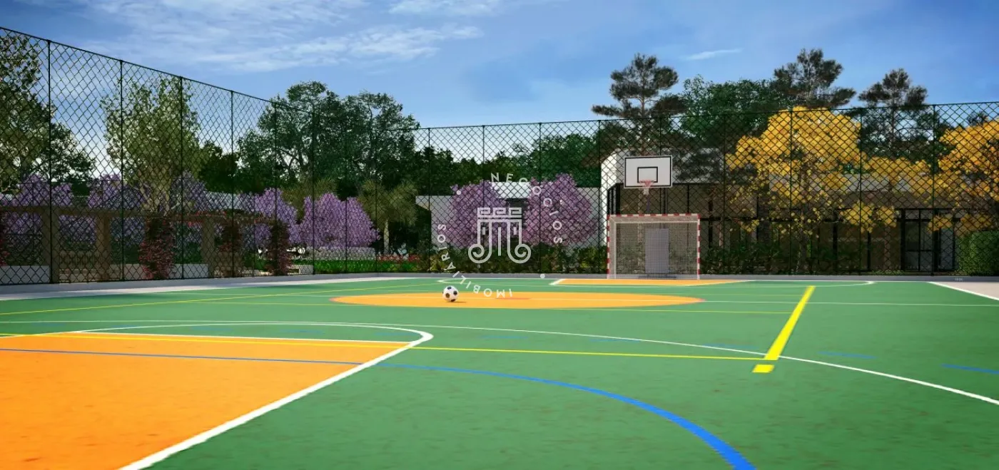 O condomínio conta com espaços projetados para atividade física ao ar livre, quadra poliesportiva, churrasqueira e quadras de tênis.