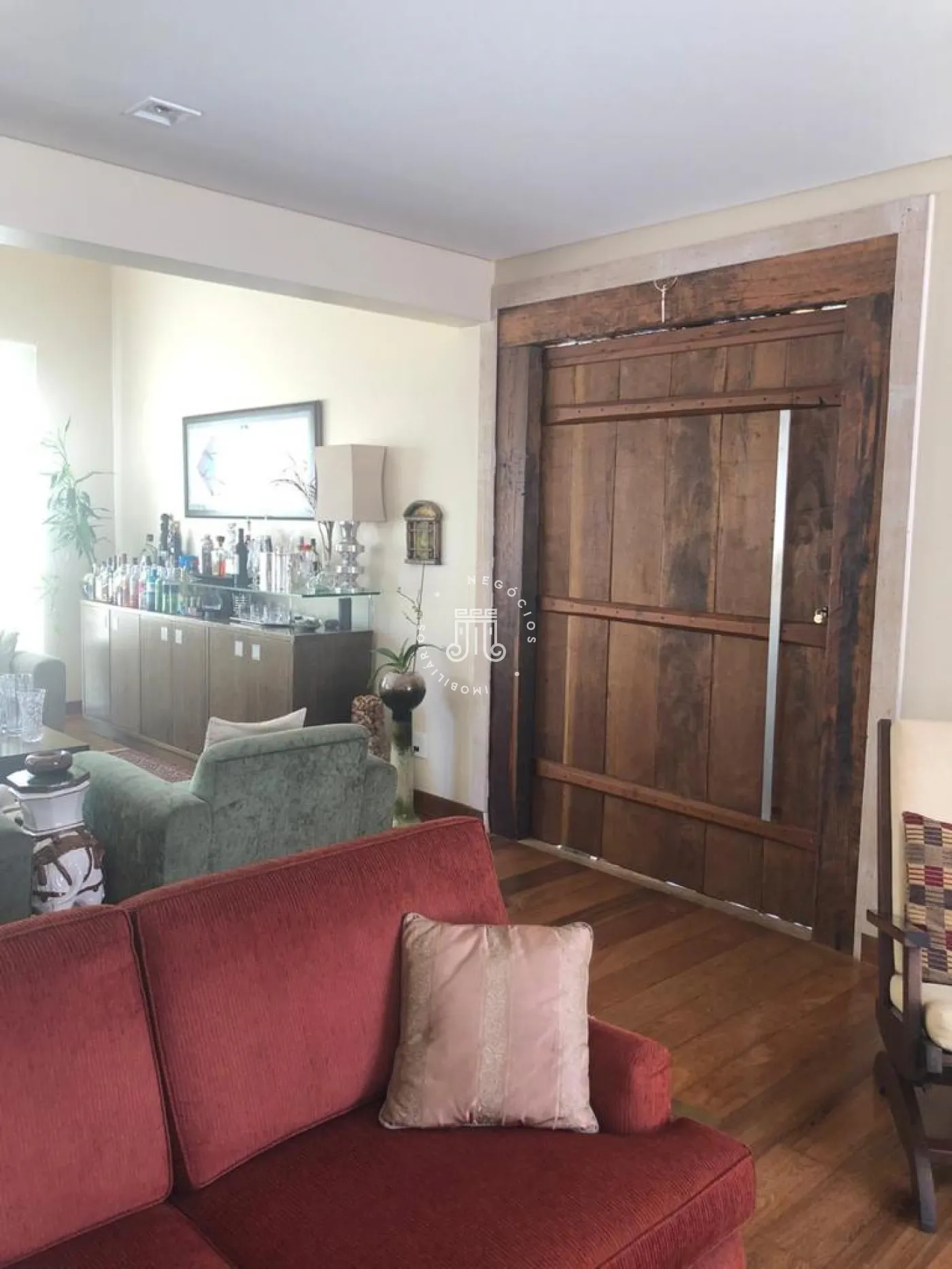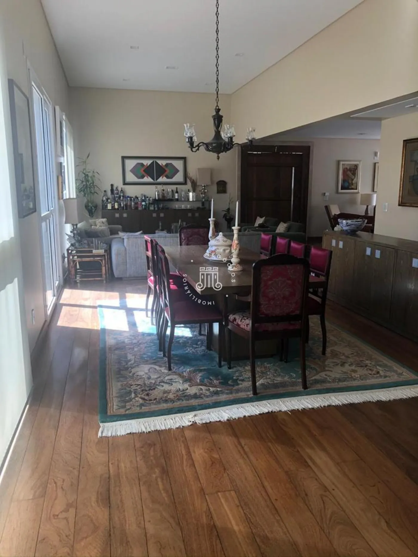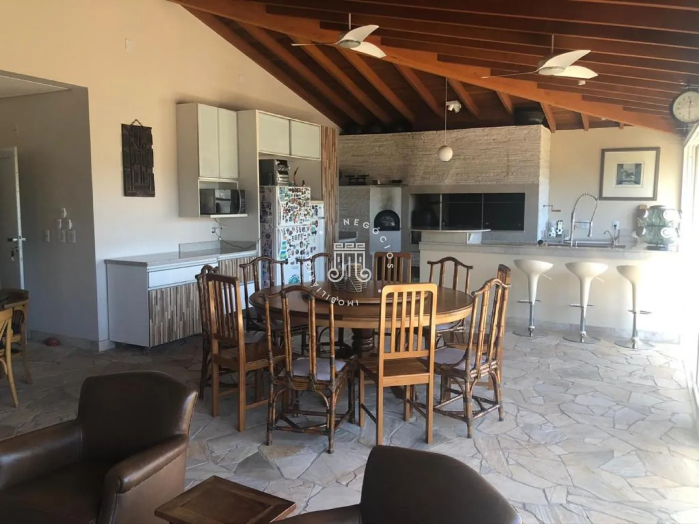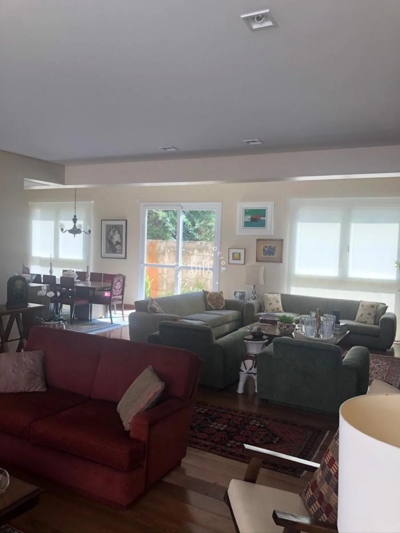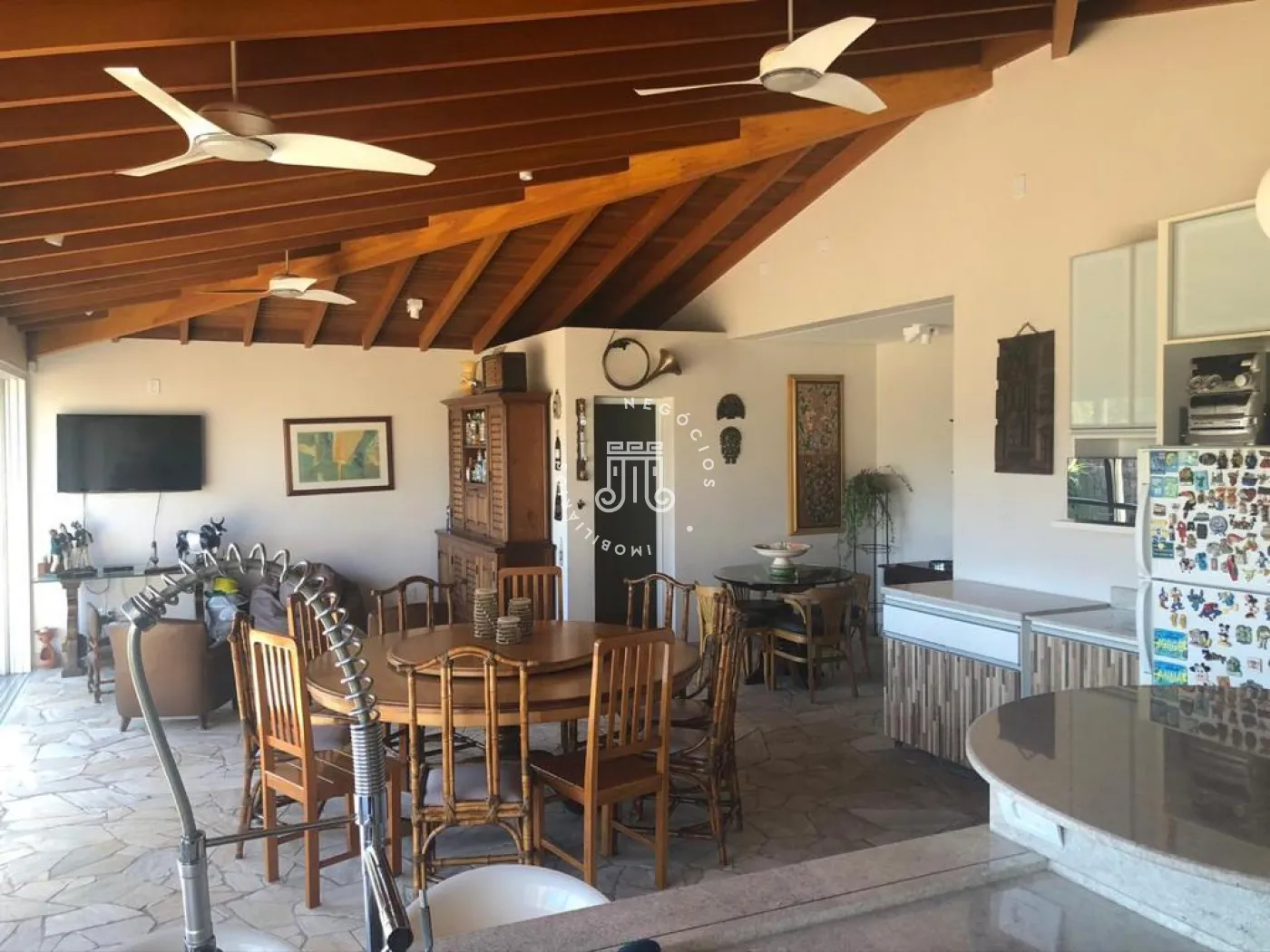 Conta com 3 suítes, quarto de empregada com banheiro, área gourmet com churrasqueira, forno de pizza e fogão à lenha, 2 salas de estar, sendo uma com lareira, sala de almoço e de jantar, cozinha com dispensa.