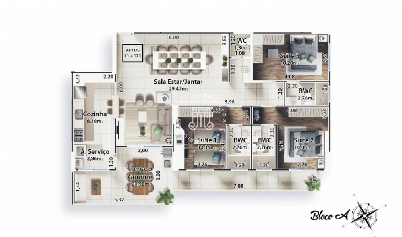 Composto por 118 m² de área útil, bem distribuídos em 03 dormitórios, sendo 03 suítes, Sala com sacada e ar condicionado , decorada para 2 ambientes, dormitórios com ares condicionados , cozinha com planejados , 01 lavabo, área de serviço com saída para sacada e 02 vagas de garagem. O Prédio possui área de lazer completa, salão de festas, salão de jogos, sala de ginástica, sauna, espaço kids, piscina, quadra de tênis, cinema, espaço zen, pista de caminhada, espaço mulher, guarita, central de gás, portão eletrônico, elevadores social e de serviço, circuito interno de tv e interfone.