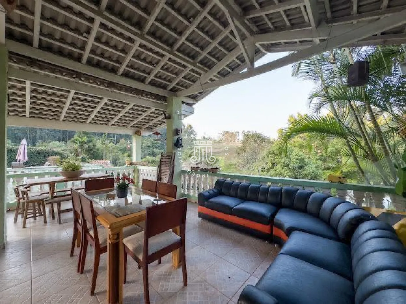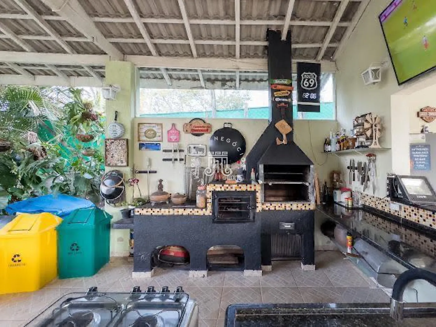 A chácara possui 2000 m² terreno e 635 m² construídos que estão distribuídos da seguinte forma: 5 suítes, sala estar com lareira, sala de tv, lavabo, cozinha, dispensa, lavanderia, churrasqueira com fogão a lenha, piscina aquecida, campo de futebol, lago privativo e garagem para 6 carros. Fotovoltaico.