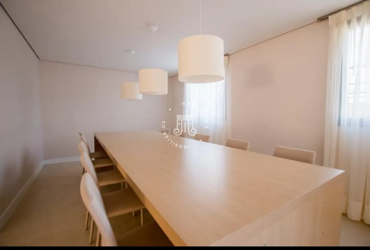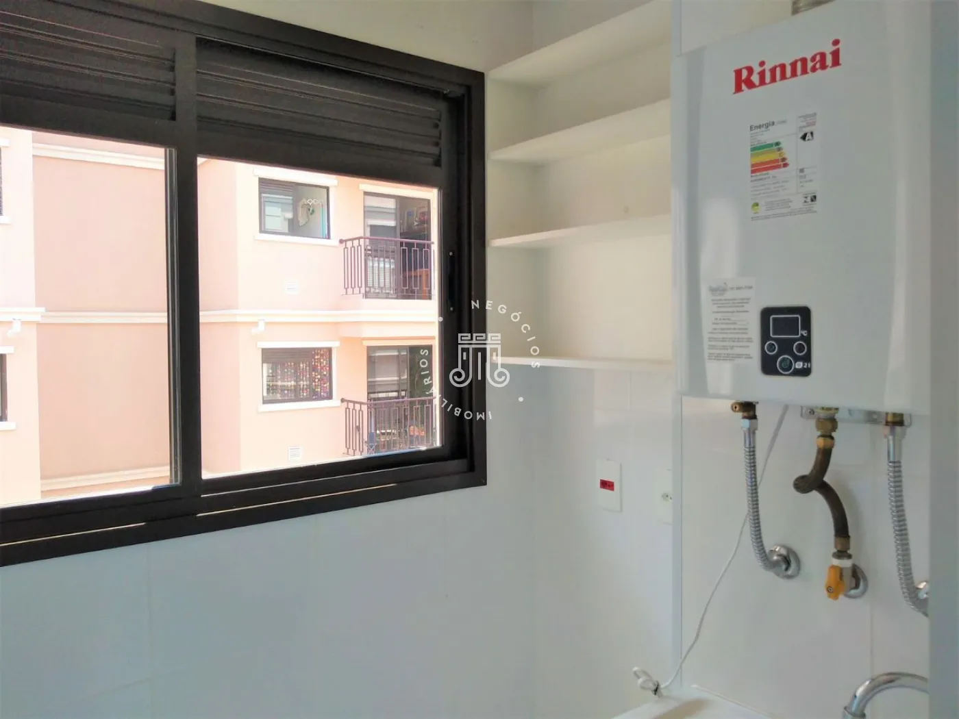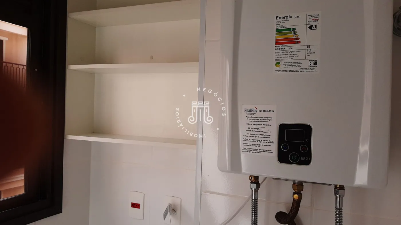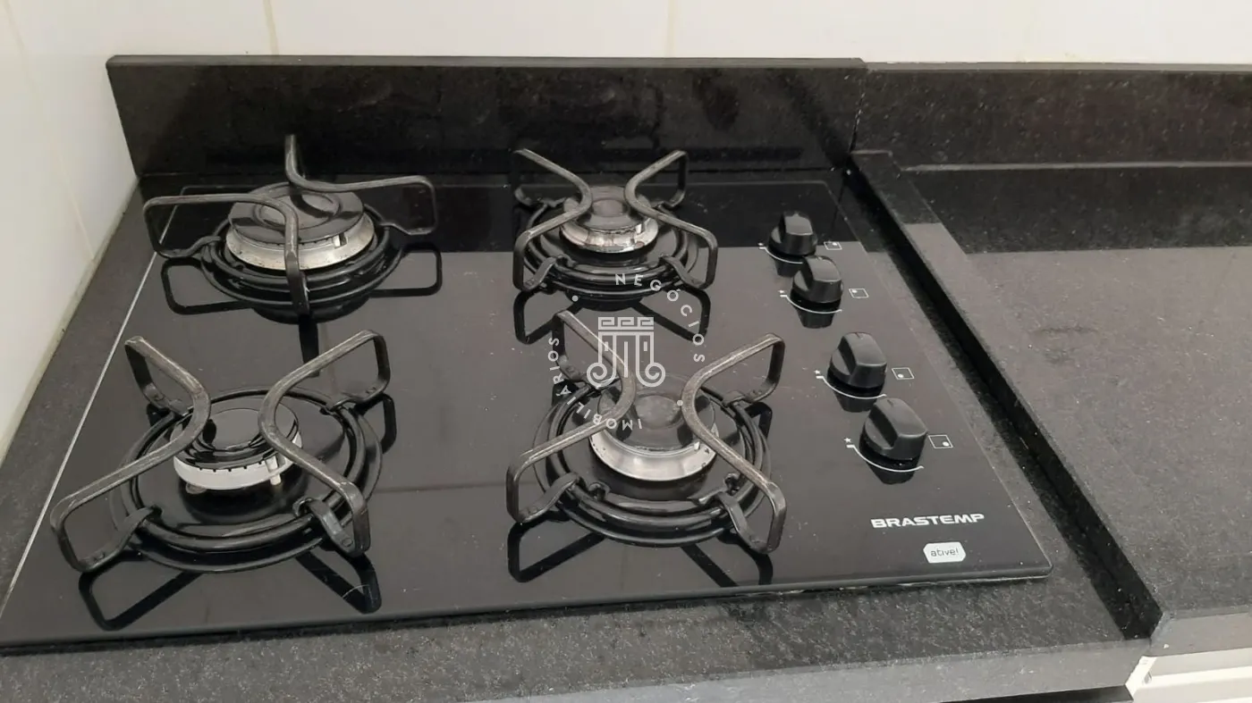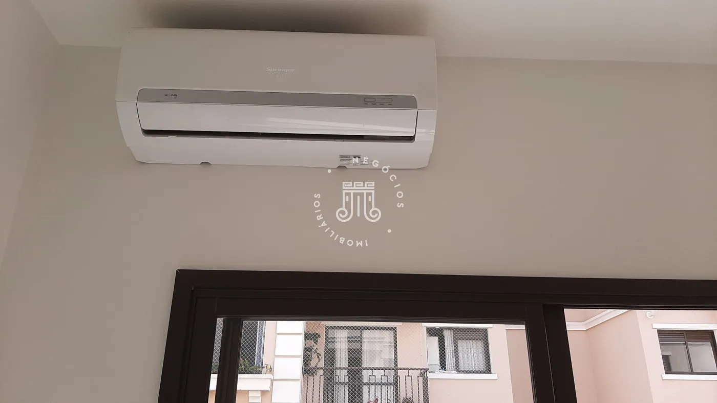 O piso é Portobello fosco, na cor cinza claro. A cozinha está equipada com fogão cooktop e o imóvel possui ar condicionado. O sistema de aquecimento de água é a gás, com aquecedor Rinnai de vinte e um litros. As vagas de garagem são espaçosas, situadas próximas ao elevador e são definitivas.